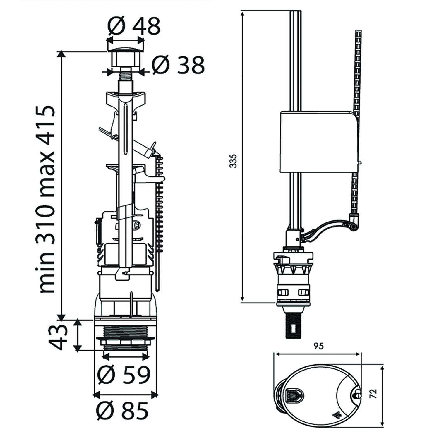 Спускной клапан одинарного смыва используется в бачках унитазов высотой от 300 до 420 мм и диаметром отверстия в крышке бачка 38-45 мм.Служит для осуществления слива воды из бачка в унитаз.Достаточное усилие на кнопку для спуска воды: для полного слива 14 Н.Скорость слива воды через клапан, не менее 2 л/с.Установленный ресурс работы, не менее 200 тыс.циклов. Наполнительный клапан с 1/2’’ пластик. штуцером;Поршневая/механическая система запирания;Простая установка и регулировка объемов слива:Рабочее динамическое давление: 0,5 - 8 бар;Максимальное статическое давление: 10 бар;5 лет гарантии.