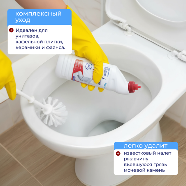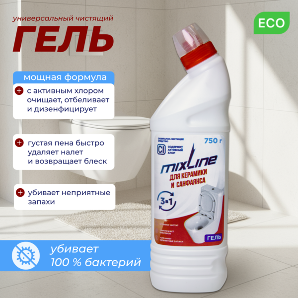 Эффективное чистящее средство MIXLINE предназначено для комплексного ухода за сантехническими поверхностями. Гель обеспечивает безупречную чистоту керамики и санфаянса, уничтожает микробы и устраняет неприятные запахи. Идеально подходит для очистки и антимикробной обработки раковин, ванн, душевых кабин и унитазов.Особенности:• Уничтожает 100% микробов• Устраняет неприятные запахи• Мощная формула с активным хлоромПрименение:Для очищения и уничтожения микробов нанести средство на поверхность, при необходимости оставить на 2-5 минут, почистить, тщательно смыть. Для удаления более стойких загрязнений выдержать 60 минут. Перед использованием рекомендуется проверить средство на небольшом незаметном участке.Важно:Не используйте средство для очистки поверхностей из нержавеющей стали, акриловых ванн, окрашенных и других чувствительных материалов.Срок годности: 24 месяца с даты изготовления (дата указана на упаковке).