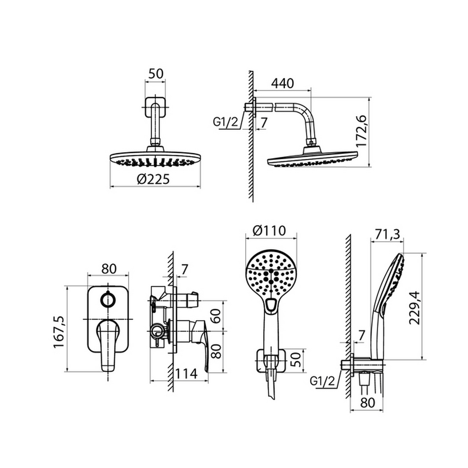 Готовый набор встраиваемой сантехники в стильном матовом черном цвете включает всё необходимое для обустройства комфортной и красивой душевой или ванны. Так выгоднее и удобнее, чем покупать всё по отдельности.Оптимальная подборка сантехники Ray: смеситель, верхняя лейка с кронштейном для тропического душа, большая ручная лейка с 3 режимами, душевой шланг 1,5 м и выход для подключения шланга с держателем для лейки.За счет скрытого монтажа и отсутствия выступающих элементов набор экономит пространство и упрощает уборку. Подключение с помощью любых труб, диаметр входных отверстий – ? дюйма.Смеситель прослужит долго благодаря надежному корпусу из прочной латуни, стойкому к коррозии, резким изменениям давления и перепадам температуры воды.Лейки благодаря большому размеру делают поток воды объемным и мягким, что создает эффект настоящего спа и обеспечивает максимум удовольствия от принятия душа. 3 режима ручной лейки меняются нажатием на кнопку.