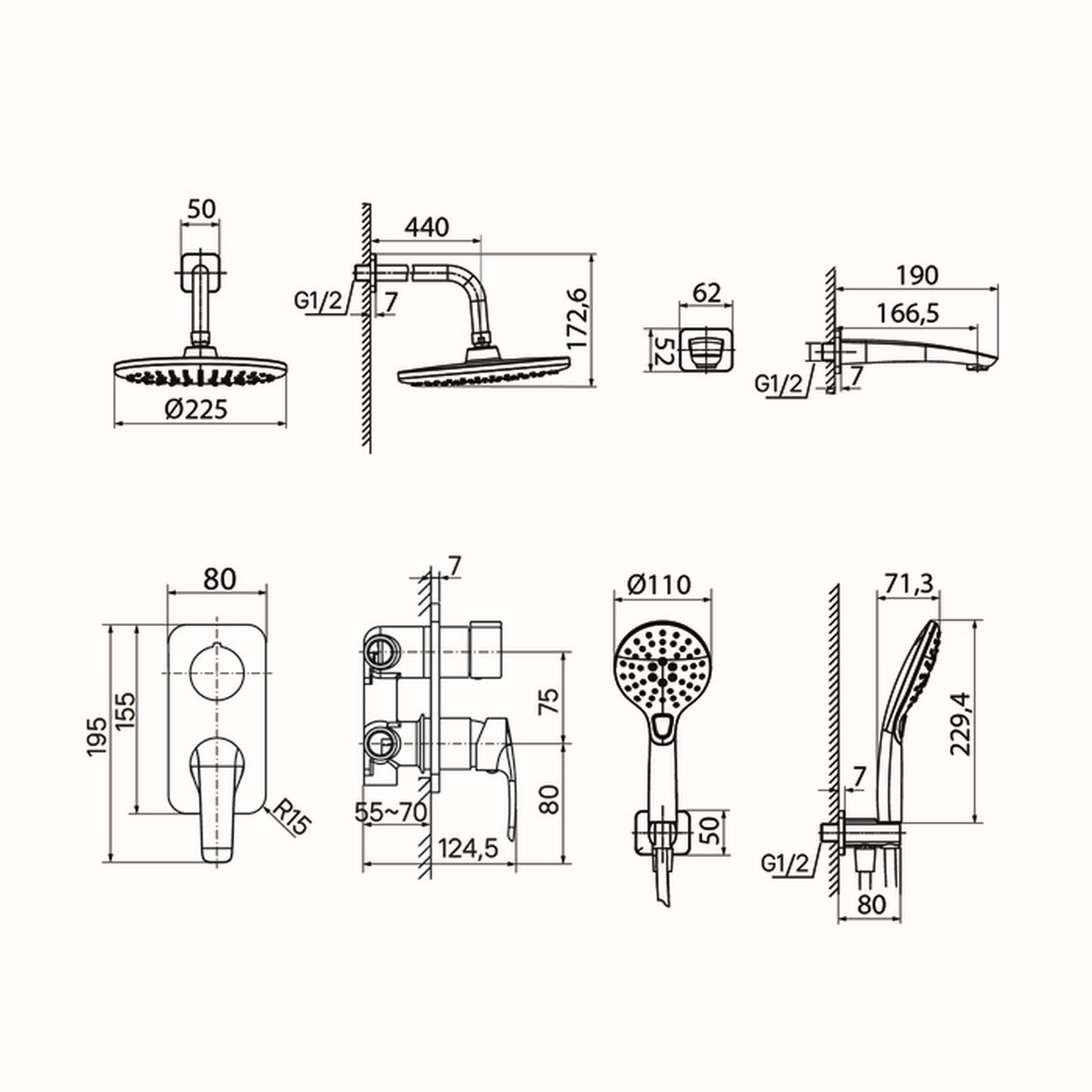 Готовый набор встраиваемой сантехники включает всё необходимое для обустройства комфортной душевой. Так выгоднее и удобнее, чем покупать всё по отдельности.Оптимальная подборка сантехники Ray в хроме: смеситель, верхняя лейка с кронштейном для тропического душа, настенный излив, большая ручная лейка с 3 режимами, душевой шланг 1,5 м и выход для подключения шланга с держателем.За счет скрытого монтажа и отсутствия выступающих элементов решение экономит пространство и упрощает уборку. Подключение с помощью любых труб, диаметр входных отверстий – ? дюйма.Смеситель прослужит долго благодаря надежному корпусу из прочной латуни, стойкому к коррозии, резким изменениям давления и перепадам температуры воды.Лейки благодаря большому размеру делают поток воды объемным и мягким, что создает эффект настоящего спа и обеспечивает максимум удовольствия от принятия душа. 3 режима ручной лейки меняются нажатием на кнопку.