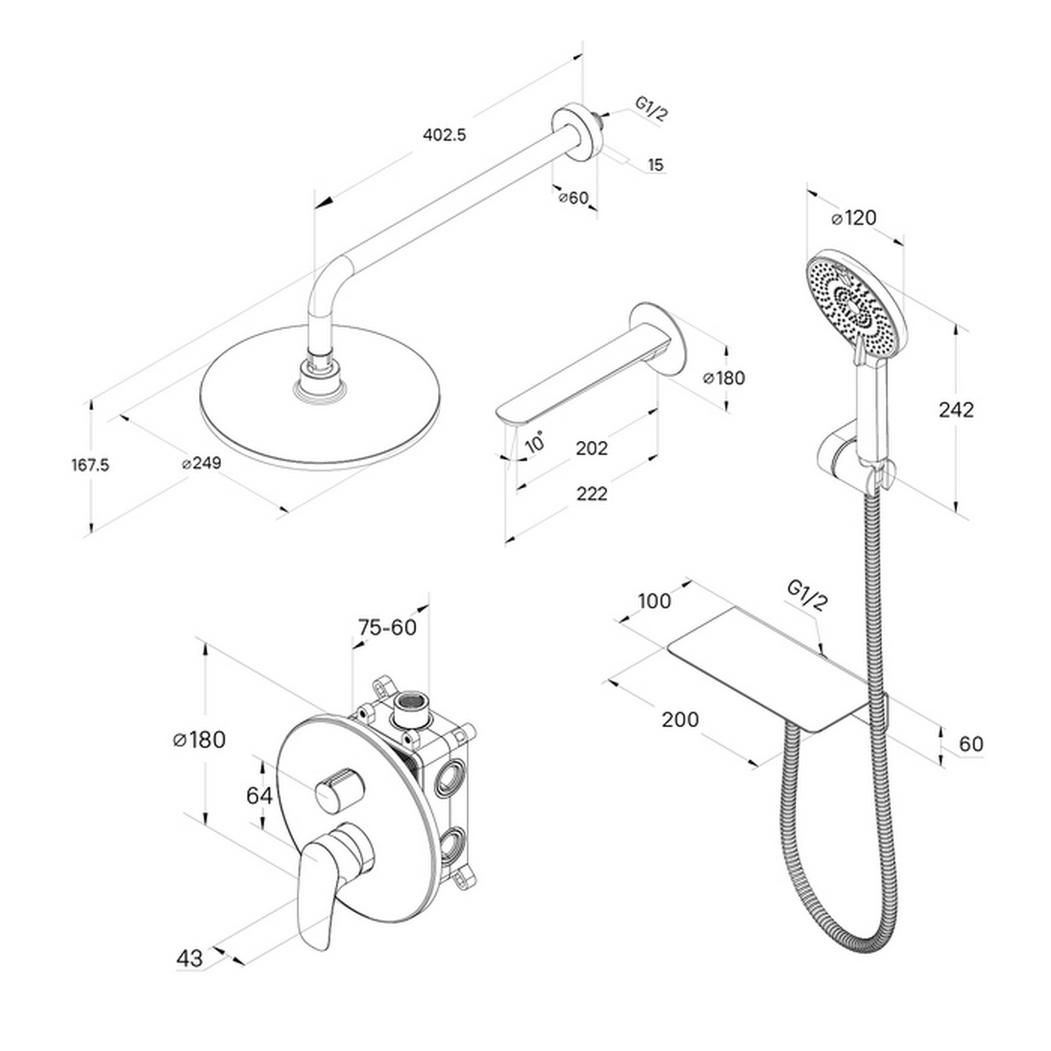 Душевая система Rora создана для тех, кто отдает предпочтение пространству, где нет ничего лишнего. С ней легко реализовать наиболее интересные дизайнерские проекты: так, например, излив с ручной лейкой и тропический душ можно разнести по разным стенам. Все внутренние механизмы системы будут спрятаны внутри встраиваемого монтажного блока, видимыми останутся только элементы управления. Душевая система на три выхода – универсальное решение: она подходит для установки как в зоне с ванной, так и душевой зоне. • Установка монтажного блока проста и возможна на стенах практически любой конструкции и материала: от гипсокартона до кирпича. А глубина установки регулируется – достаточно срезать выступающие гофрированные края.• Пластиковый бокс защищает устройство подачи воды от внешнего воздействия, что продлевает срок службы системы.• Подходит для систем с водой высокой температуры (70-80 °С) в трубах. Например, при эксплуатации с газовой колонкой.• В комплекте есть все, что нужно, чтобы начать пользоваться сразу: ПВХ-шланг (1,5 м), четырехрежимная ручная лейка, тропический душ и выход для шланга, оснащенный полочкой для размещения косметических средств.• Гарантия на душевую систему Milardo® – 7 лет, на водозапорный механизм – 3 года, на душевые аксессуары – 1 год.