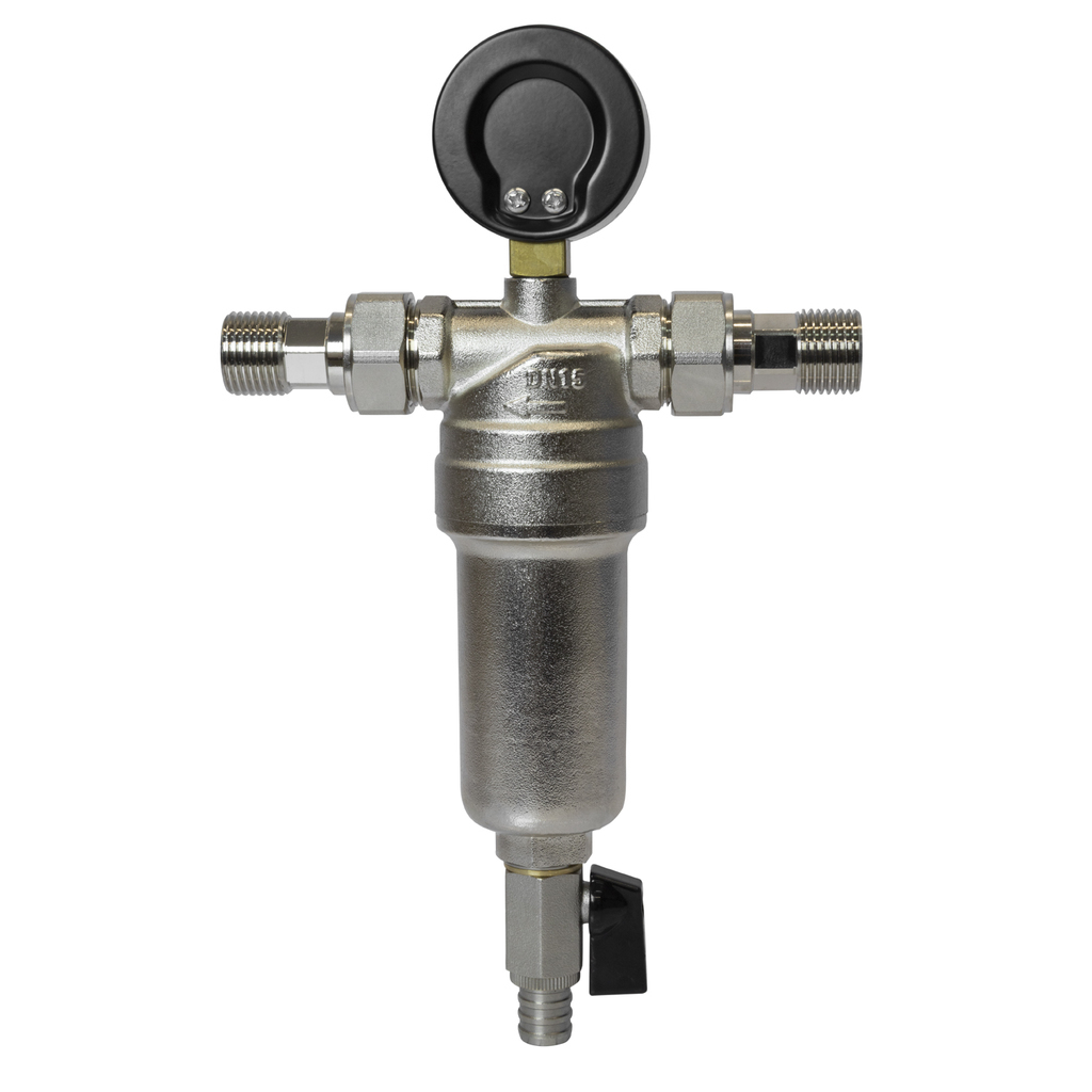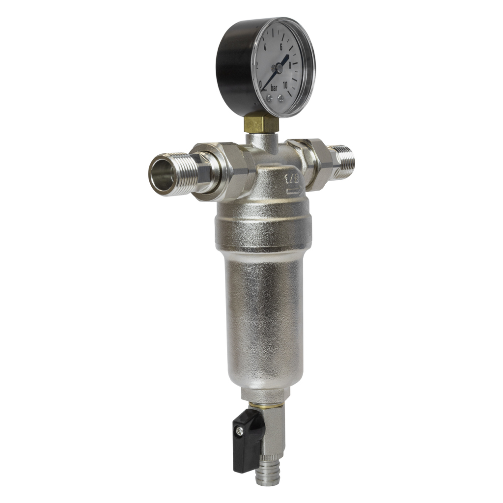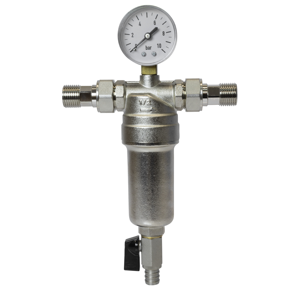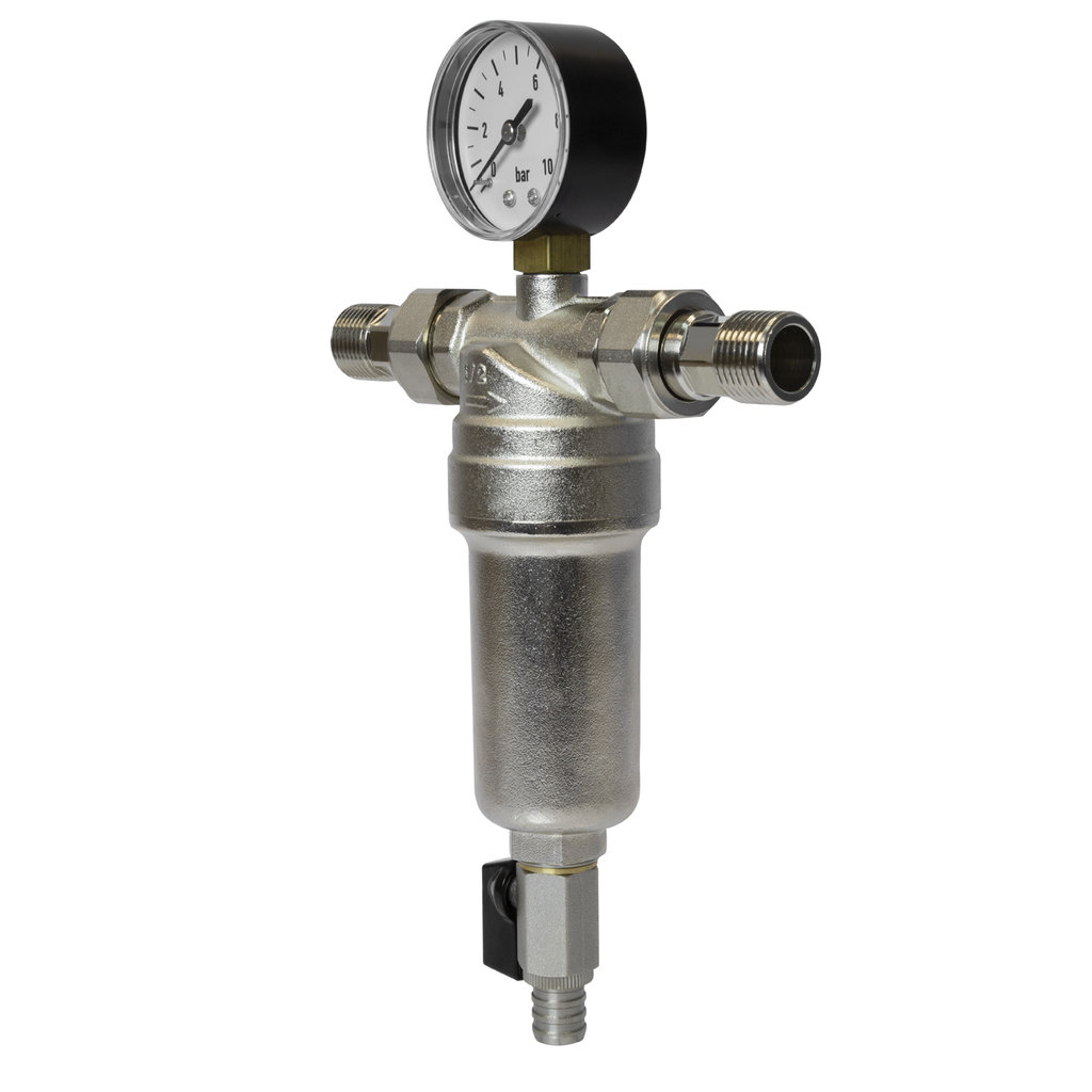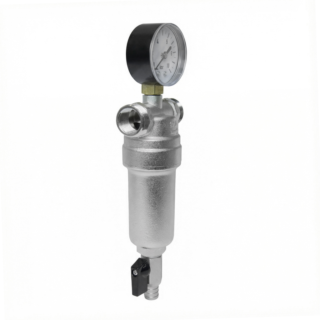 Самоочищающийся фильтр с манометром для комплексной защиты системСамоочищающийся фильтр 1/2 с манометром. Этот продукт сочетает в себе многоступенчатую очистку, удобство обслуживания и визуальный контроль параметров системы.Ключевые преимущества:- Двойная фильтрация - два фильтров элемента из нержавеющей стали для эффективного удаления механических примесей разной фракции- Самоочистка без демонтажа - функция промывки без извлечения сетчатых вставок через дренажный кран со штуцером для шланга- Визуальный контроль - встроенный манометр для оперативного мониторинга давления в системе- Долговечность - корпус и колба из никелированной латуни обеспечивают коррозионную стойкость- Компактность - оптимальные габариты для монтажа в ограниченном пространствеТехнические характеристики:Максимальное рабочее давление: 10 Бар Максимальная рабочая температура: 80 °С Размер присоединения: 1/2 Тип резьбы: наружная