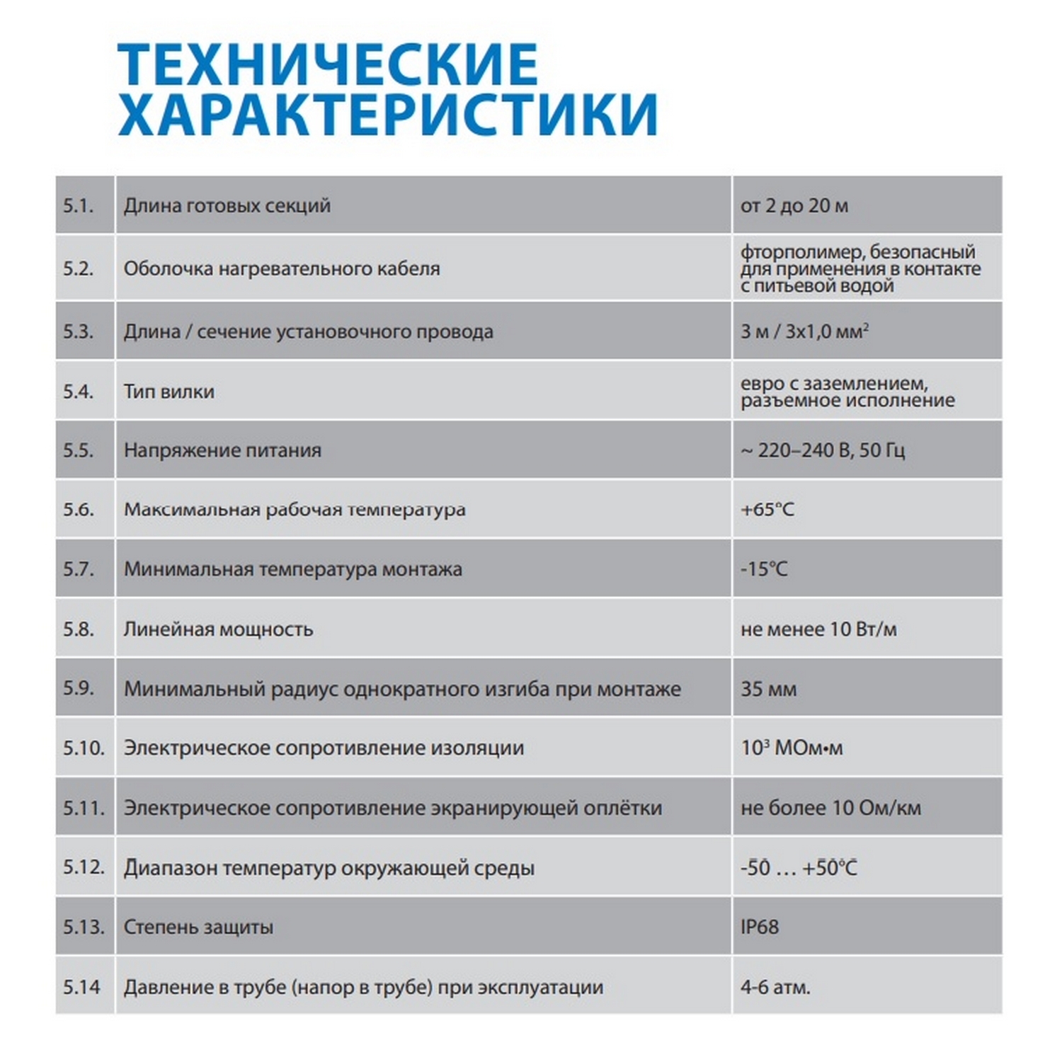 Секция нагревательная кабельная Freezstop Inside представляет собой изделие, изготовленное на основе саморегулирующегося нагревательного кабеля, который поддерживает необходимую температуру трубопровода в течение всего холодного периода, обеспечивая его качественную и бесперебойную работу и сохранность.Система обогрева трубопроводов Freezstop Inside - идеальное решение для обогрева труб небольшого диаметра. Устанавливается внутри трубы с водой или другой неагрессивной средой, а также снаружи трубопровода (опционально).Нагревательная секция представляет собой отрезок саморегулирующегося кабеля, оснащенный трехметровым установочным проводом с евровилкой на конце с одной стороны и концевой муфтой с другой.В целях электробезопасности и защиты полупроводящая матрица имеет изоляцию из термопластичного эластомера (ТПЭ), поверх которого наложена оплетка из луженой меди и оболочка из фторполимера.Соединительная и концевая муфты изготовлены в заводских условиях, надежны и герметичны.Электропитание осуществляется от сети напряжением 220-240 В, подводится с одного конца. В конце участка обогрева установлена концевая муфта, размещаемая внутри трубы и обеспечивающая защиту IP68. Для ввода в трубу используется специальный cальниковый узел, состоящий из двух втулок, двух шайб и резинового уплотнения.Сальниковый узел рассчитан на 2 типа резьбы - 3/4" и 1".Для Freezstop Inside гарантийный срок - 2 года с даты продажи.Срок службы составляет не менее 20 лет.Состав комплекта:- Секция нагревательная кабельная - 1 шт;- Инструкция по монтажу и эксплуатации - 1 шт;- Паспорт на изделие - 1 шт;- Упаковочная коробка - 1 шт;- Сальниковый узел - 1 шт.
