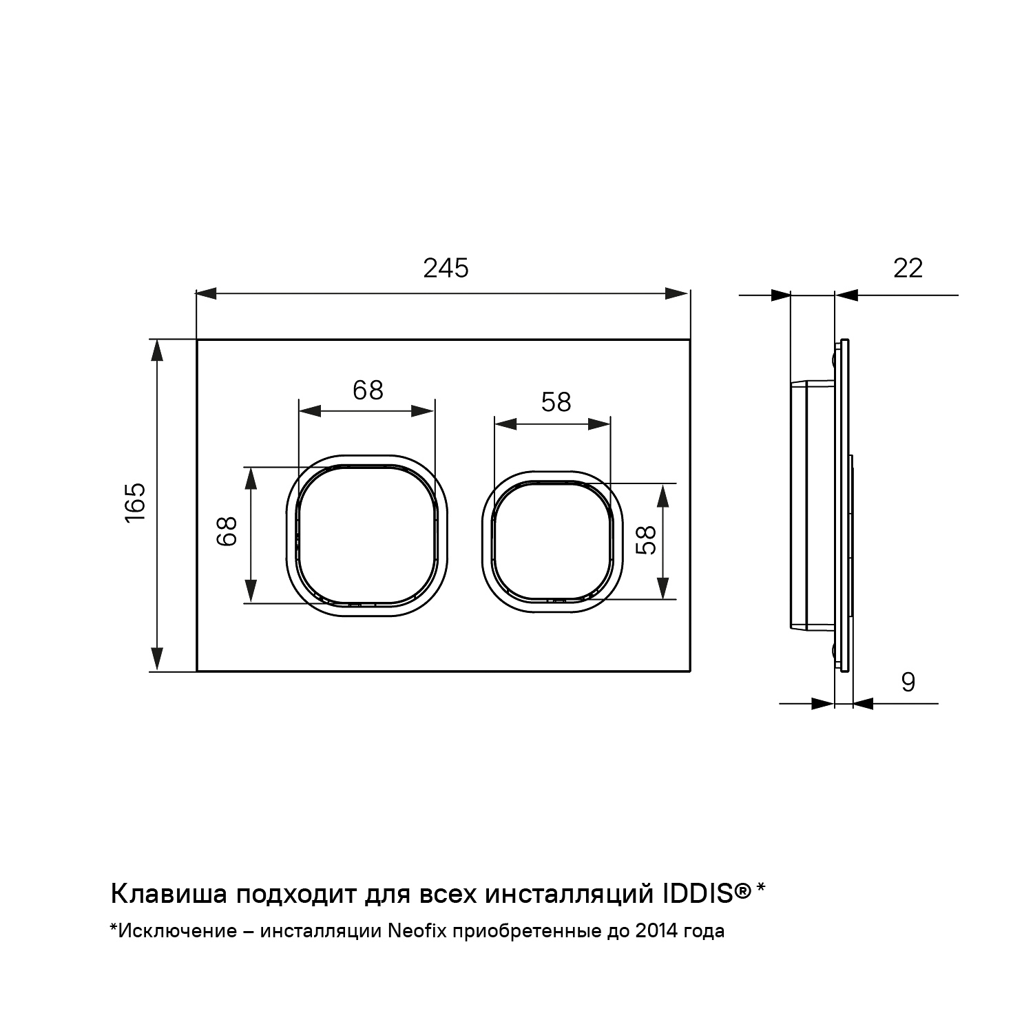 Клавиша IDDIS® Uniglass составит базовый комплект с современной подвесной сантехникой – изделие совместимо со всеми моделями инсталляций IDDIS®.Баланс белого стекла и хромированной рамки кнопок смотрится эксклюзивно и благородно. Такое изделие будет одинаково уместно в любых пространствах. Плоская и эстетичная клавиша смыва займет пространство размером не более ежедневника (24,5 на 16,5 см). Она легко монтируется и снимается для удобного доступа к крану открытия-закрытия воды и обслуживания арматуры.Покрытие клавиши IDDIS® изготовлено из закаленного стекла – ударопрочного и безопасного материала, устойчивого к механическим повреждениям.Технология двухрежимного смыва (малым или большим объемом) обеспечивает ощутимую экономию потребления воды.Гарантия на все клавиши IDDIS® – 3 года.