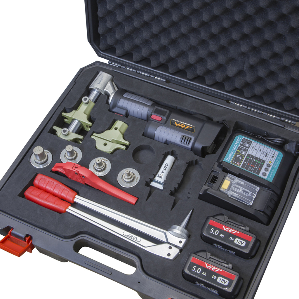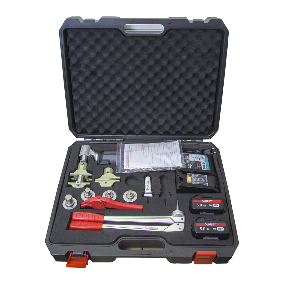 Аккумуляторный расширительный инструмент служит для расширения полиэтиленовых труб диаметром от 16 до 32 мм. Имеет автоматически поворачивающуюся головку, которая обеспечивает возможность точного выполнения работы. Имеет встроенный индикатор заряда аккумулятора и защиту от перегрузки. Гарантия 24 месяца.В комплект входит: 1. Аксиальный инструмент для обжима;2. Аккумулятор литиево-ионный - 2 шт; напряжение 18 Вт;3. Устройство для зарядки;4. Набор вкладышей от 16 до 32 диаметра;5. Ручной расширитель и головки для ручного расширителя 16-20-25-32 PEX;6. Тюбик со смазкой;7. Резак для резки труб диаметром 16-32 мм;8. Технический паспорт;9. Чемодан для хранения и переноски инструмента.