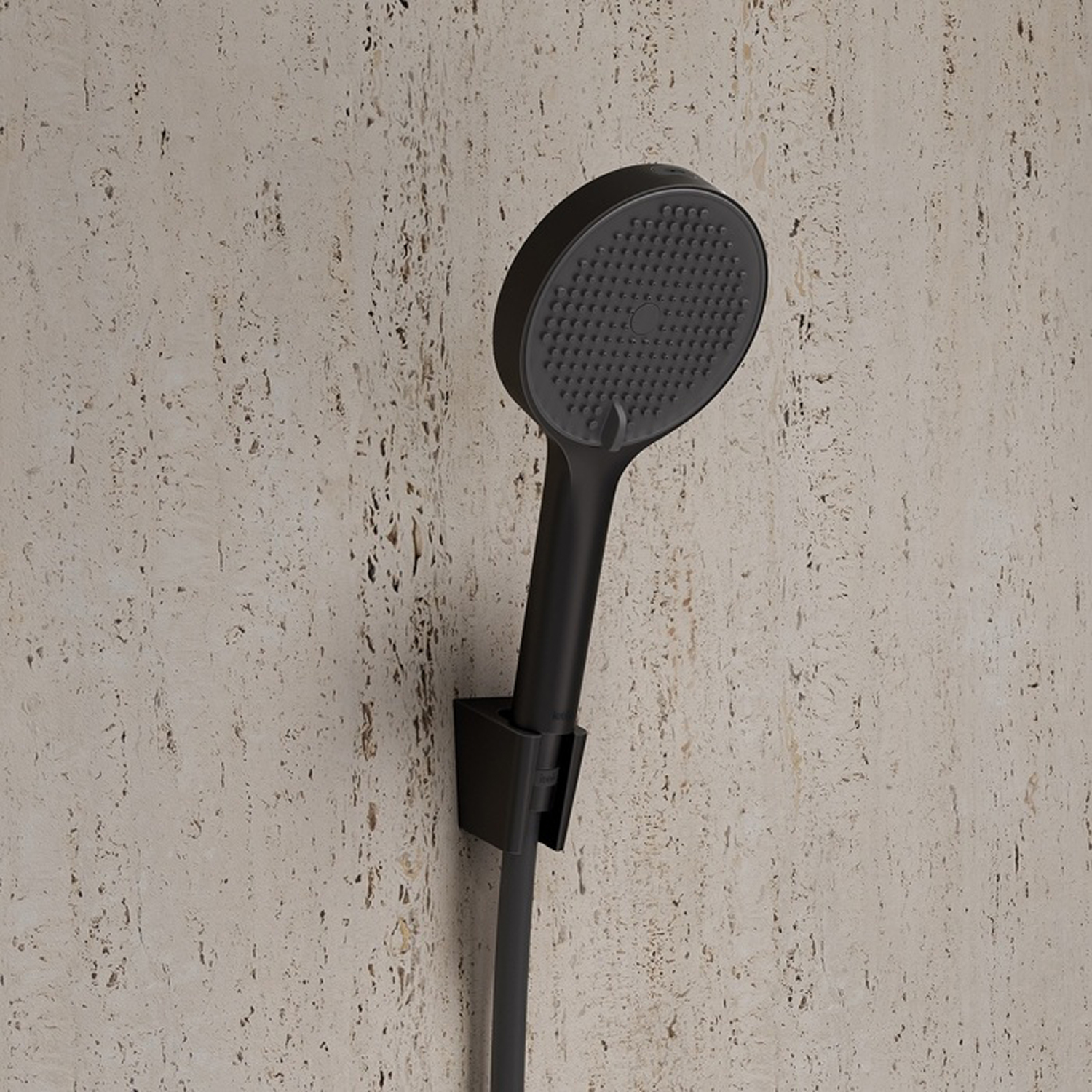 Ручная лейка для душа Aiger (диаметр 120 мм) в матовом черном исполнении сочетает эстетику и функциональность. Гармонично комбинируется с любой сантехникой благодаря универсальному подключению и монохромному дизайну с тактильными силиконовыми форсунками.Функциональные возможности:• 3 режима работы (дождь, массаж, комбинированный) с переключением рычагом• Дополнительный режим MonoClean — интенсивная струя для гигиенической обработки поверхностей• Микроперфорация создает насыщенный, но мягкий поток водыПрактичность:Силиконовые форсунки самоочищаются от налета при касанииИзносостойкое покрытие сохраняет внешний вид при регулярном использованииУстойчивость к коррозии и механическим повреждениямЭргономичное решение для современной ванной комнаты, где важны детали и долговечность.Размер изделия, мм: 250х120х26