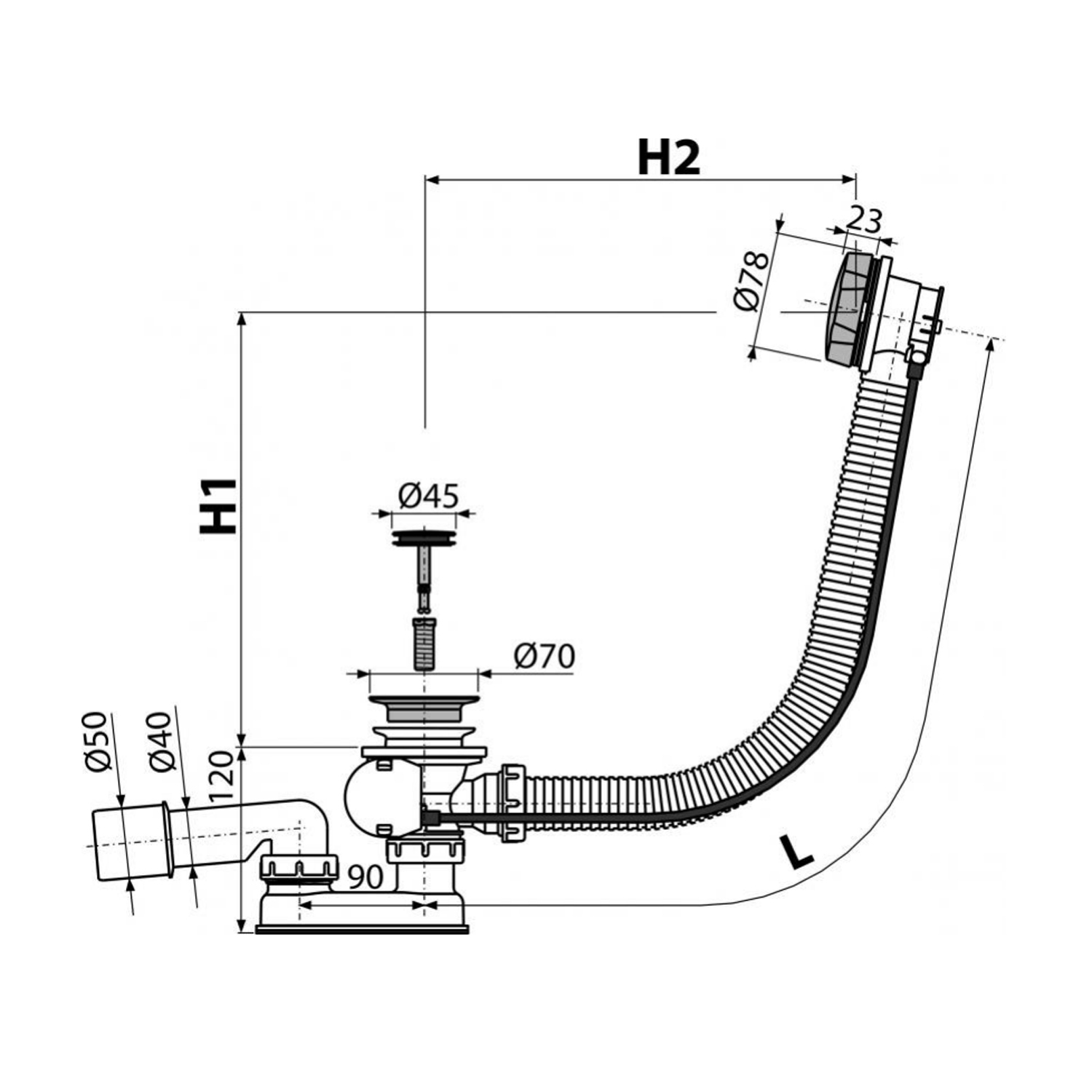 Область применения: - для слива воды из ванны в канализационный сток;- для ванн стандартных размеров;- для ванн с выпускным отверстием 52 мм.Свойства: - система для ванны слив-перелив;- мокрый гидрозатвор с вращающимся коленом;- закрытие сливного клапана с помощью троса;- гибкий шланг системы перелива.Технические параметры: - гидрозатвор 50 мм;- скорость стока воды 51,6 л/мин;- скорость перелива 42 л/мин;- сопротивление гидрозатвора 588 Па;- термическая устойчивость 95° С.