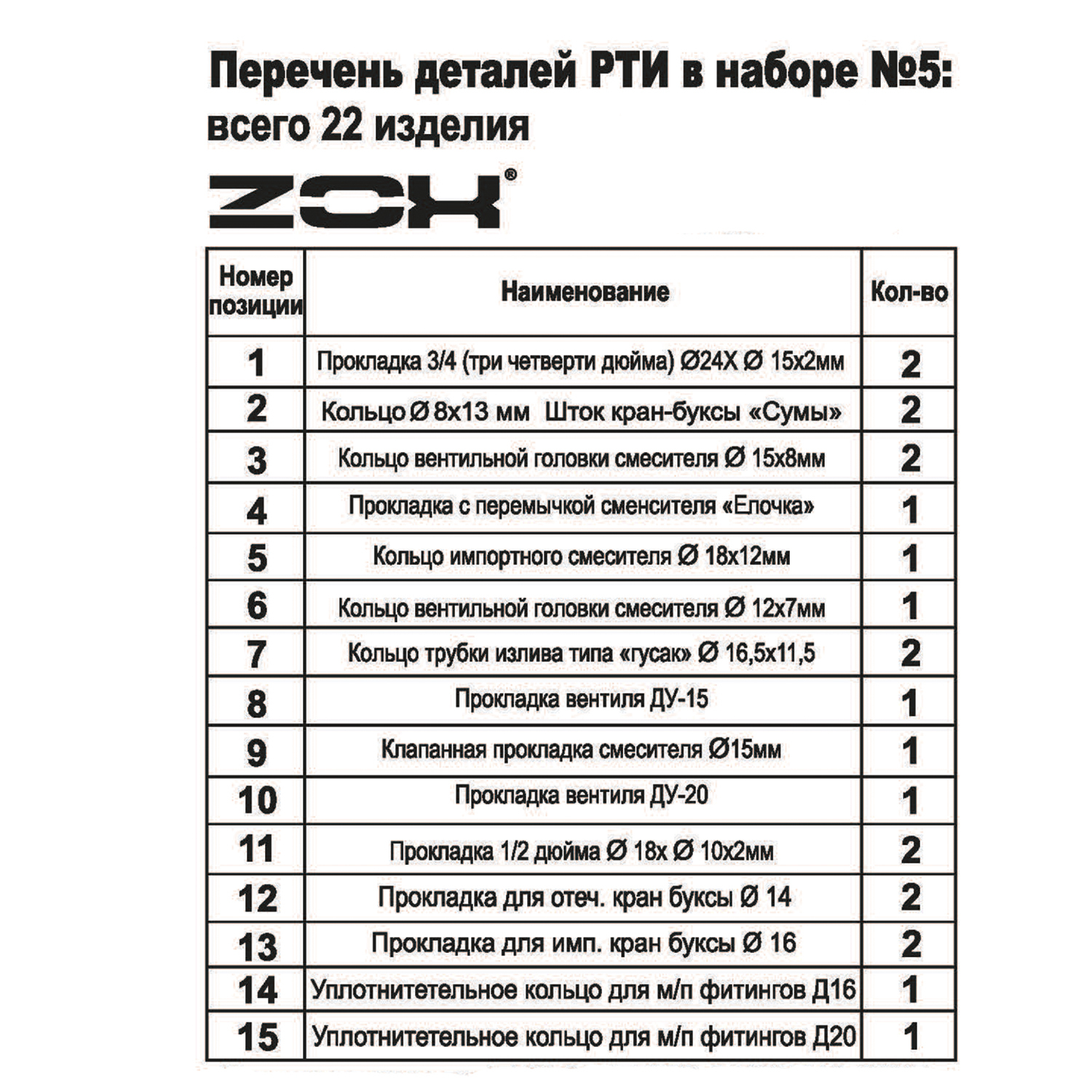 Универсальный набор состоящий из колец, прокладок и клапанов. Предназначен дял ремонта и установки в отечественные и импортные смесители, вентили, гибкие подводки, водяные счетчики и кран-буксы различной модификации. Набор состоит из 22 изделий (14 видов).