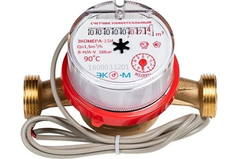 Принцип работы счетчика состоит в измерении числа оборотов крыльчатки, вращающейся поддействием потока протекающей воды.В момент совершения полного оборота счетного механизма геркон подает электрический импульс, который, считывается внешним устройством и подается на сигнальный пульт.Электронная система импульсного водосчетчика отвечает за подсчет длительности импульса, интервал подачи которого зависит от скорости потока воды. Примечательно, что импульсный водяной счетчик не требует дополнительного источника питания: геркон сам генерирует электромагнитный импульс и вызывает замыкание слаботочной электроники.Комплектация:Счетчик воды ЭКОМЕРА-15И – 1 шт.Паспорт – 1 экз.Комплект монтажных частей (штуцер 2шт., накидная гайка 2 шт., прокладка 2шт.)Упаковка – 1 шт.Средний срок службы 12 лет.Межпроверочный интервал 6 лет.