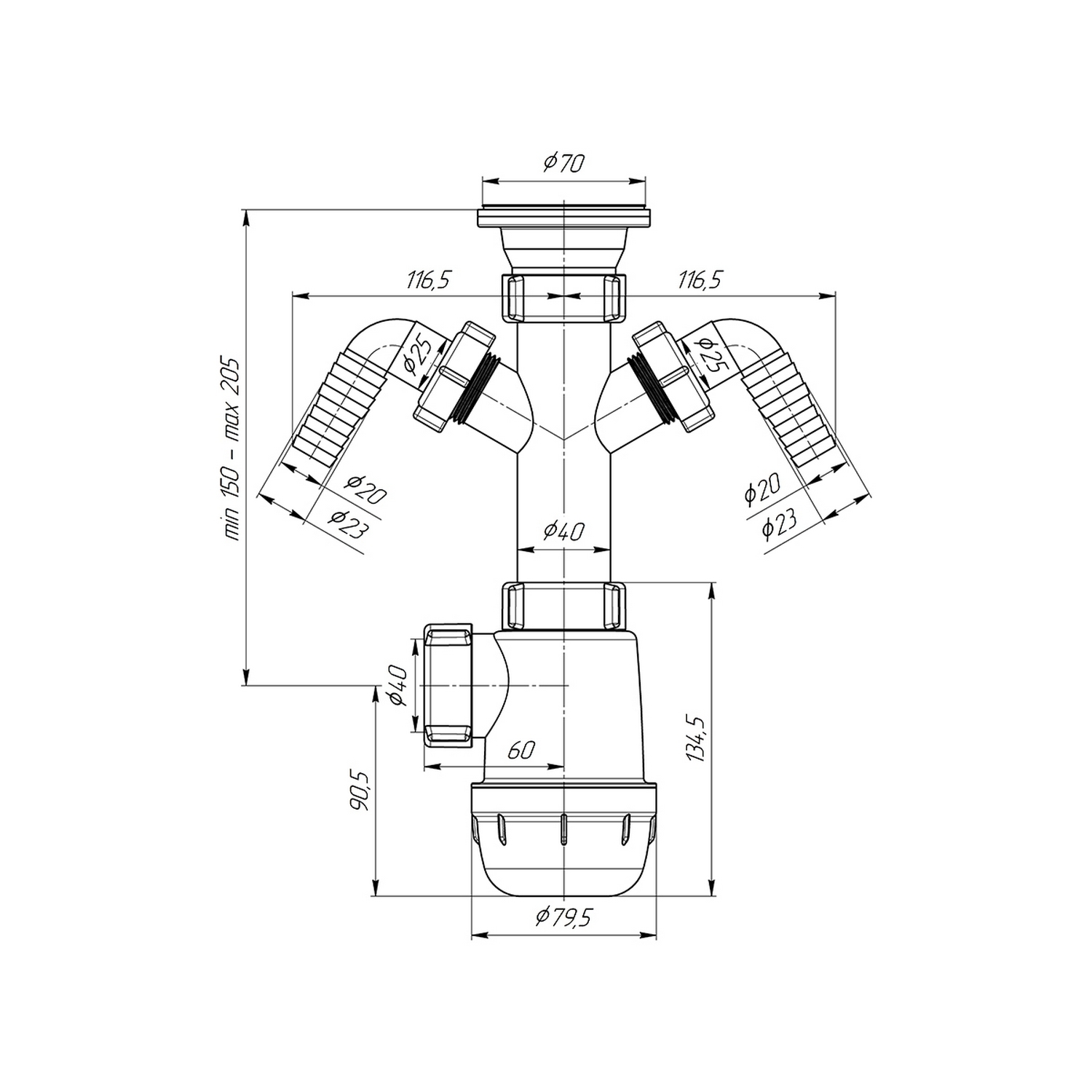 Сифон для кухонных моек с диаметром сливного отверстия 50мм, бутылочного типа с увеличенным корпусом, с разборным выпуском и нержавеющей решеткой, с двумя отводами для подключения бытовой техники. Выход для подключения к канализации 40мм.Форма сифона позволяет поддерживать хорошую пропускную способность слива сточной воды, выполняя свою главную функцию - формирование гидрозатвора для отсечения неприятных запахов из канализации.Конструкция позволяет легко, без демонтажа, снять отстойник (стакан) и почистить сифон в случае засорения, достать случайно упавшие в слив раковины мелкие ценные вещи.