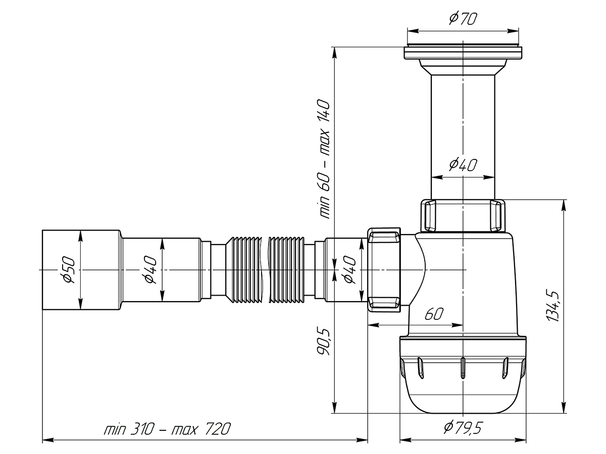 Сифон для кухонных моек с диаметром сливного отверстия 50мм, бутылочного типа с увеличенным корпусом, с литым выпуском и нержавеющей решеткой. Для подключения к канализации комплектуется гибкой трубой 40*40/50мм.Форма сифона позволяет поддерживать хорошую пропускную способность слива сточной воды, выполняя свою главную функцию - формирование гидрозатвора для отсечения неприятных запахов из канализации.Конструкция позволяет легко, без демонтажа, снять отстойник (стакан) и почистить сифон в случае засорения, достать случайно упавшие в слив раковины мелкие ценные вещи.