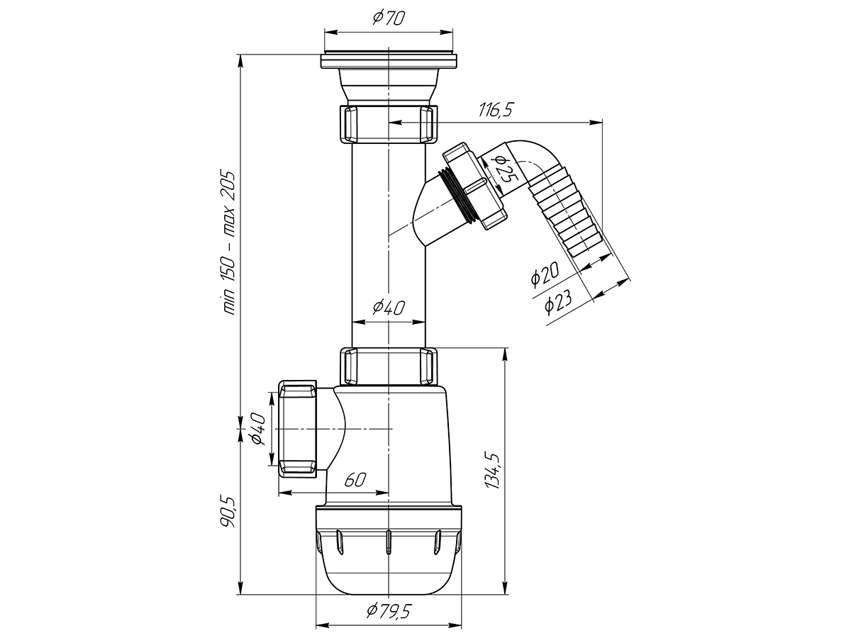 Сифон для кухонных моек с диаметром сливного отверстия 50мм, бутылочного типа с увеличенным корпусом, с разборным выпуском и нержавеющей решеткой, с отводом для подключения бытовой техники. Выход для подключения к канализации 40мм.Форма сифона позволяет поддерживать хорошую пропускную способность слива сточной воды, выполняя свою главную функцию - формирование гидрозатвора для отсечения неприятных запахов из канализации.Конструкция позволяет легко, без демонтажа, снять отстойник (стакан) и почистить сифон в случае засорения, достать случайно упавшие в слив раковины мелкие ценные вещи.