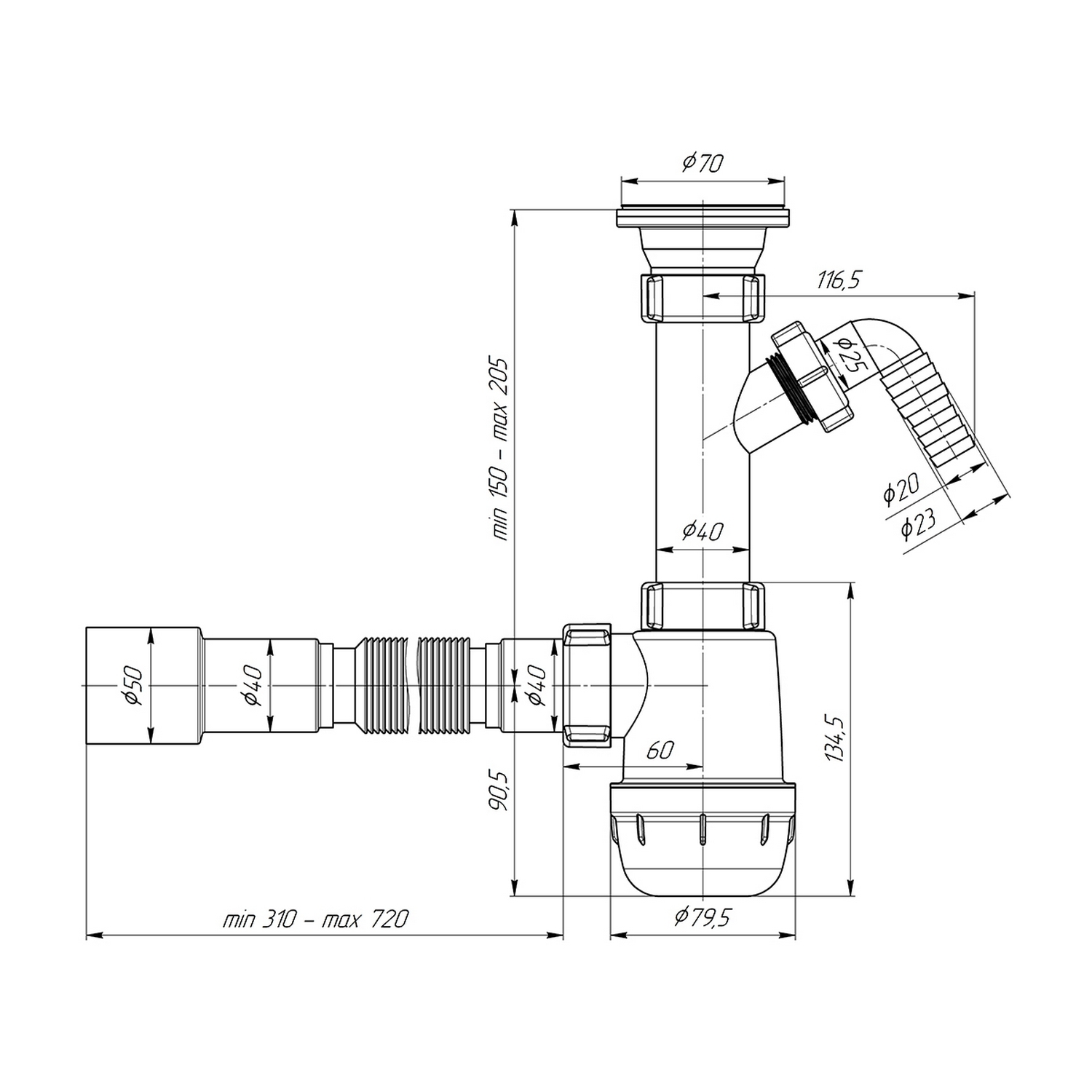Сифон для кухонных моек с диаметром сливного отверстия 50мм, бутылочного типа с увеличенным корпусом, с разборным выпуском и нержавеющей решеткой, с отводом для подключения бытовой техники. Для подключения к канализации комплектуется гибкой трубой 40*40/50мм.Форма сифона позволяет поддерживать хорошую пропускную способность слива сточной воды, выполняя свою главную функцию - формирование гидрозатвора для отсечения неприятных запахов из канализации.Конструкция позволяет легко, без демонтажа, снять отстойник (стакан) и почистить сифон в случае засорения, достать случайно упавшие в слив раковины мелкие ценные вещи.
