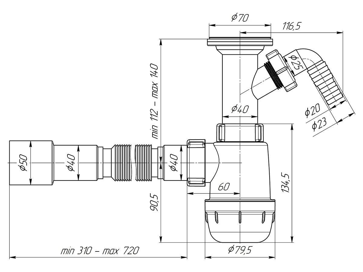 Сифон для кухонной мойки с диаметром сливного отверстия 50мм, бутылочного типа с увеличенным корпусом, с литым выпуском и нержавеющей решеткой. С отводом для стиральной машины, для подключения к канализации комплектуется гибкой трубой 40*40/50мм.Форма сифона позволяет поддерживать хорошую пропускную способность слива сточной воды, выполняя свою главную функцию - формирование гидрозатвора для отсечения неприятных запахов из канализации.Конструкция позволяет легко, без демонтажа, снять отстойник (стакан) и почистить сифон в случае засорения, достать случайно упавшие в слив раковины мелкие ценные вещи.