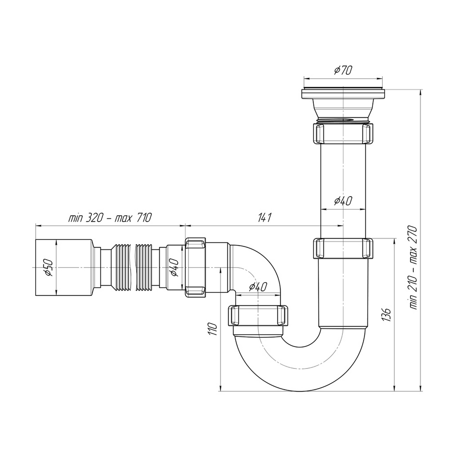 Сифон сливной АНИ пласт D0110 для кухонных моек с диаметром сливного отверстия 50-60 мм, прямоточного типа, с решеткой слива D 70мм при выпуске 1 1/2". Комплектуется гибкой трубкой 40*50мм для отвода в канализацию. Высота: 210 - 270 мм.Благодаря своей форме прямоточный сифон имеет высокую скорость слива сточной воды, а так же самый простой способ прочистки без демонтажа. Сифон прост в установке и выполняет свою главную функцию - формирование гидрозатвора для отсечения неприятных запахов из канализации.Комплектация: сифон с разборным выпуском, гибкая труба для подключения к канализации 40*50мм, упаковка.