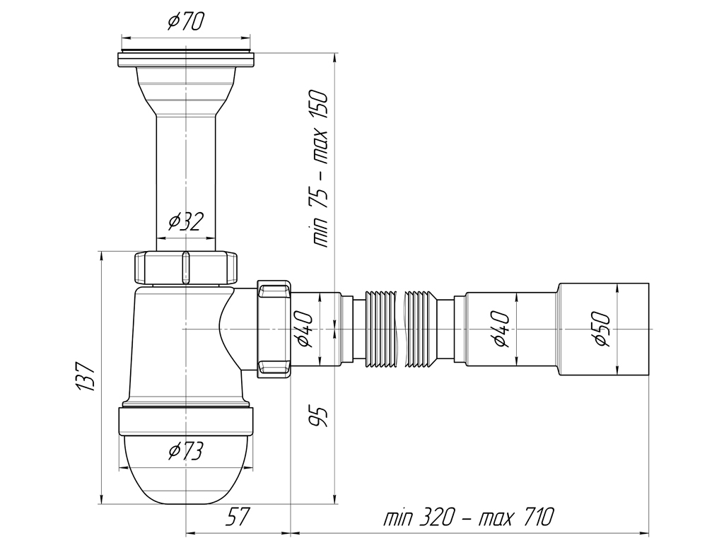 Сифон для кухонной мойки с диаметром сливного отверстия 50мм, бутылочного типа, с литым выпуском и нержавеющей решеткой, для подключения к канализации комплектуется гибкой трубой 40*40/50мм.Форма сифона позволяет поддерживать хорошую пропускную способность слива сточной воды, выполняя свою главную функцию - формирование гидрозатвора для отсечения неприятных запахов из канализации.Конструкция позволяет легко, без демонтажа, снять отстойник (стакан) и почистить сифон в случае засорения, достать случайно упавшие в слив раковины мелкие ценные вещи.