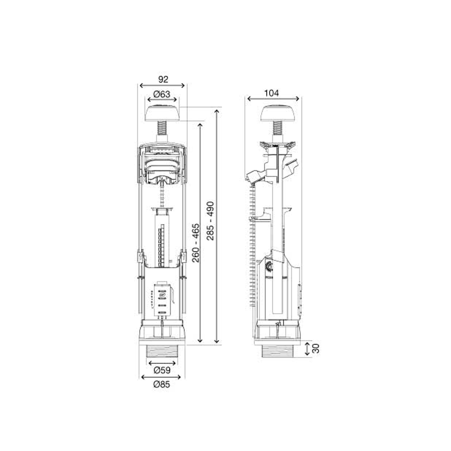 Спускной клапан с системой двойного слива с возможностью регулировки объема половинного и полного слива воды;Универсальная нажимная кнопка, расположенная сверху, фиксирует керамическую крышку бачка;Есть возможность смещения кнопки в керамической крышке (25 мм по каждой оси);Механическая система слива