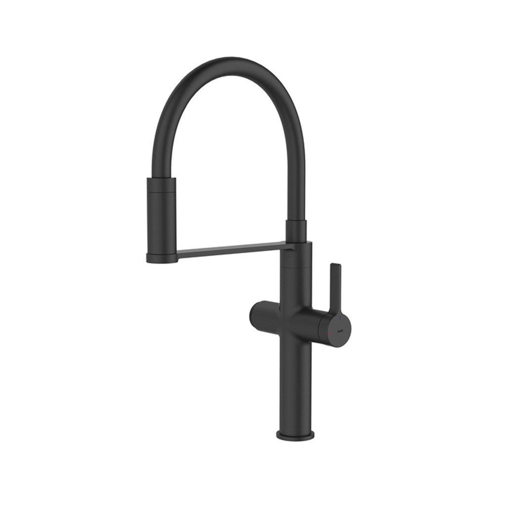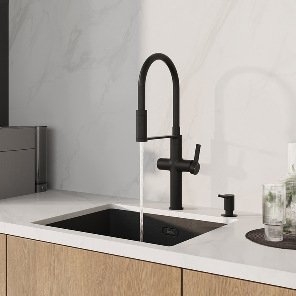 Профессиональный смеситель для кухни Ikon в чёрном цвете с гибким изливом и отдельным каналом для фильтрованной воды. Современный, продуманный и функциональный, он успешно справляется с повседневными задачами на кухне. Гибкий излив позволяет направить струю воды в нужную точку. Излив фиксируется магнитным замком за одну секунду.Встроенный канал для фильтрованной воды – можно наслаждаться чистой питьевой водой прямо из-под крана. Удобное переключение одним нажатием кнопки. Фильтр в комплекте не идёт и приобретается отдельно.Высокий – удобно размещать под ним посуду большого объема.Излив из термостойкого силикона просто содержать в чистоте за счет гладкости и стойкости к грибку. Он приятен на ощупь и моется обычным средством.Прослужит долго благодаря корпусу из прочной латуни, стойкому к коррозии, изменениям давления и перепадам t воды.Быстрая установка: ключи для монтажа гибкой подводки идут в комплекте.Гарантия на смесители IDDIS® — 10 лет.