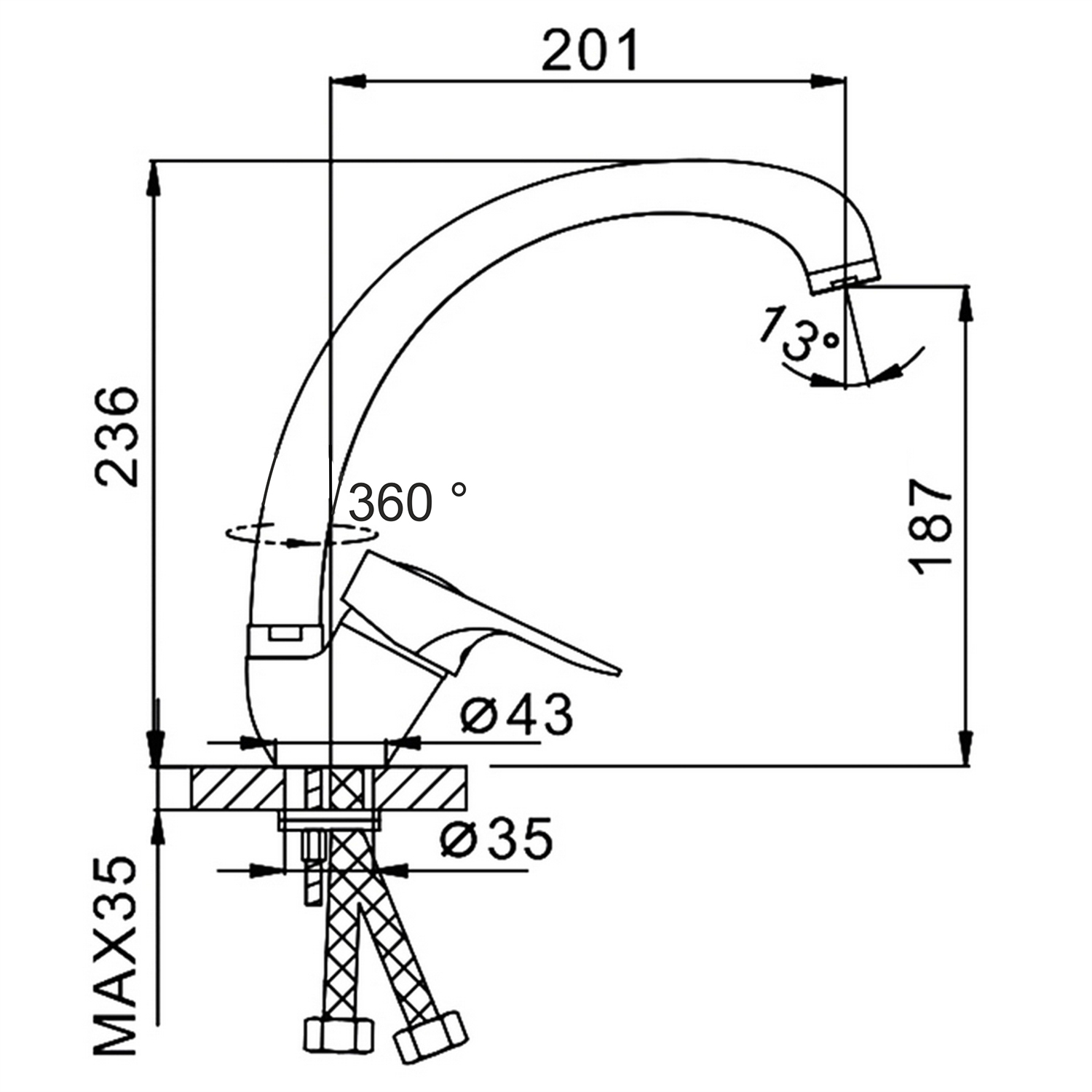 Смеситель для кухни 40к F4128-В FRAP с отв бок.ручка (выс.пов. излив, п/шпильку, хром, силумин)