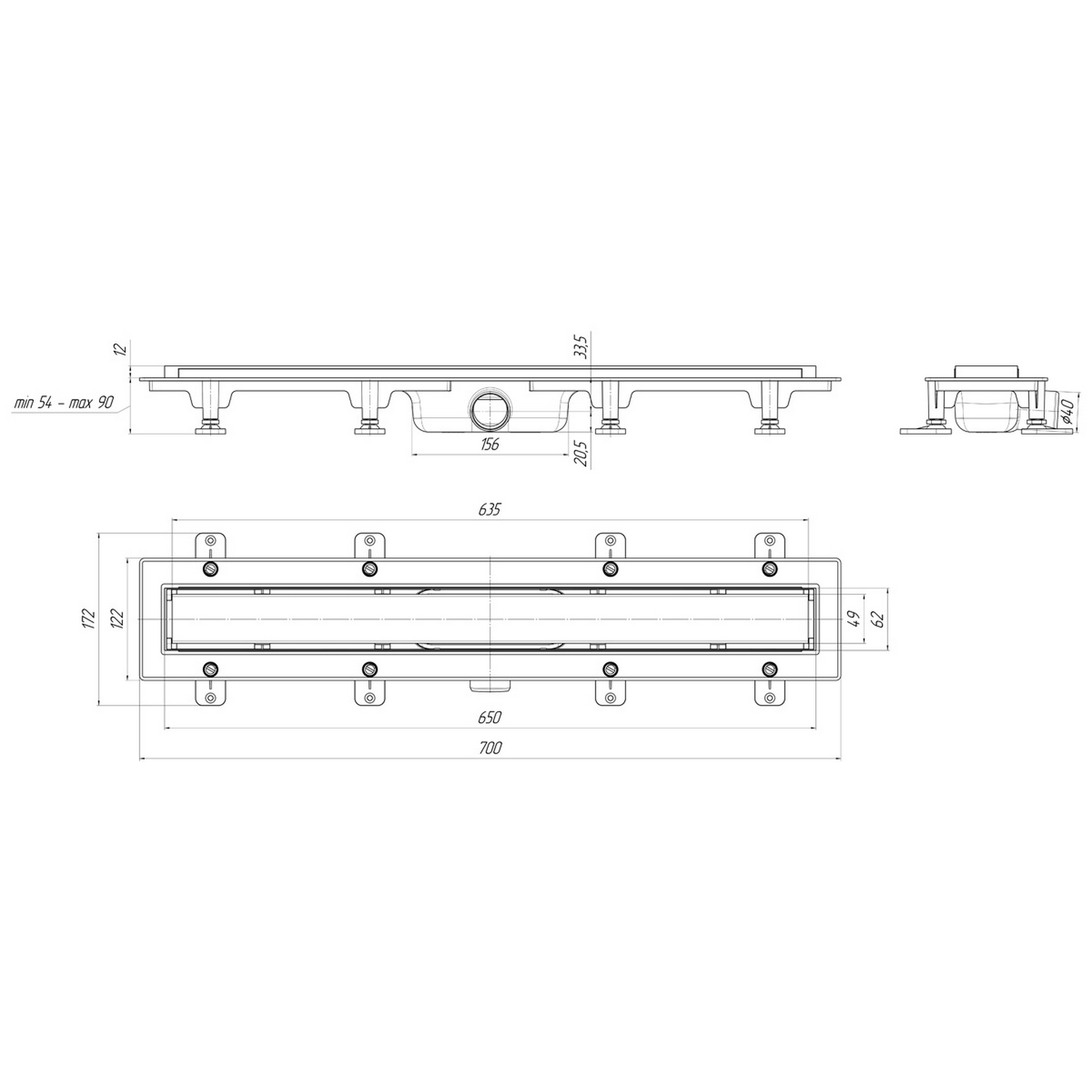 Линейный трап для душа с сухим затвором TLQ1165M – классическое техническое решение для отвода воды из ванной комнаты.Имеет вытянутую прямоугольную форму, его также называют дренажным каналом или душевым лотком. Сверху конструкция трапа закрывается декоративной решеткой из нержавеющей стали.Трап с сухим затвором - идеальное решение при нерегулярном водоотведении и использовании теплого пола.Трап устанавливается в пол, общую высоту монтажа можно регулировать от 66 до 102 мм.Трап изготовлен из прочного АБС-пластика, устойчивого к высоким температурам, ударным нагрузкам и воздействию влаги. Отличается надежностью конструкции и продолжительным сроком эксплуатации. Устанавливается по краям или в углах душевой комнаты и фиксируется с помощью крепежных элементов.Слив горизонтальный, диаметр выпуска 40 мм. Пропускная способность — 45 л/мин.Сверху трап закрывает прямоугольная гладкая матовая решетка (нержавеющая сталь), которая задерживает мусор, препятствуя забиванию слива, а также выполняет декоративную функцию.На решетку можно становиться, принимая душ: изделие выдерживает нагрузку до 300 кг.