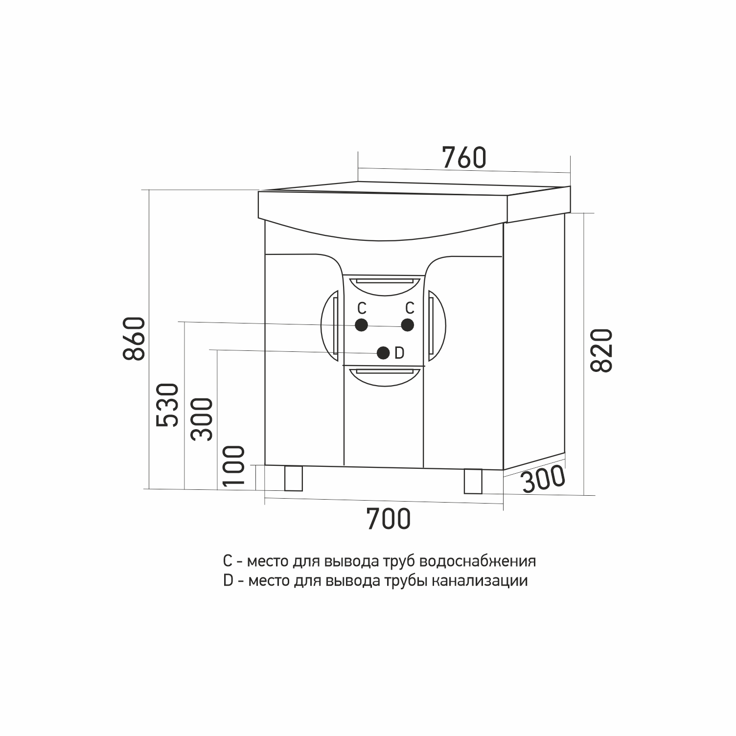 Этот комплект мебели с оригинальным дизайном. Знаковой фигурой является тумба с геометрическими линиями на фасаде. Хорошо подобранная фурнитура усиливает эффект четких прямых линий и формирует правильный квадрат в центре.