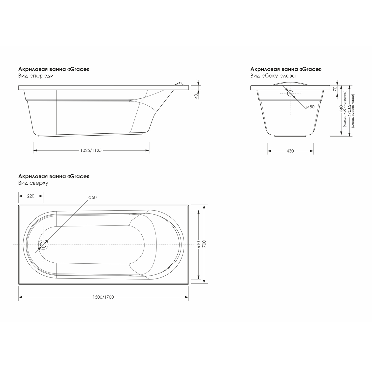 Акриловая ванна Grace - это сочетание функциональности и оригинальности, современный дизайн и лёгкость в уходе.Изготовлена из ударопрочного и устойчивого к царапинам сантехнического акрила. Армирована жестким полиуретаном.Для очистки ванны следует использовать мягкую губку и моющие средства, которые подходят для акриловых ванн.Категорически запрещается использовать абразивные моющие средства, жесткие губки или щетки.Не допускайте контакта моющих средств с изделием более 5 минут.Рекомендуется раз в полгода проверять степень затяжки гаек на каркасе для ванны.Акриловая ванна Grace имеет собственную упаковку из гофрокартона крафт, которая защищает борта изделия по всему периметру. На дно ванны приклеивается стикер и вкладывается паспорт изделия.Объем ванны до края борта - 270л.Объем ванны до перелива - 210л.Диаметр сливного отверстия - 50мм.Максимальная нагрузка на дно ванны при установке на каркас - 500кг.