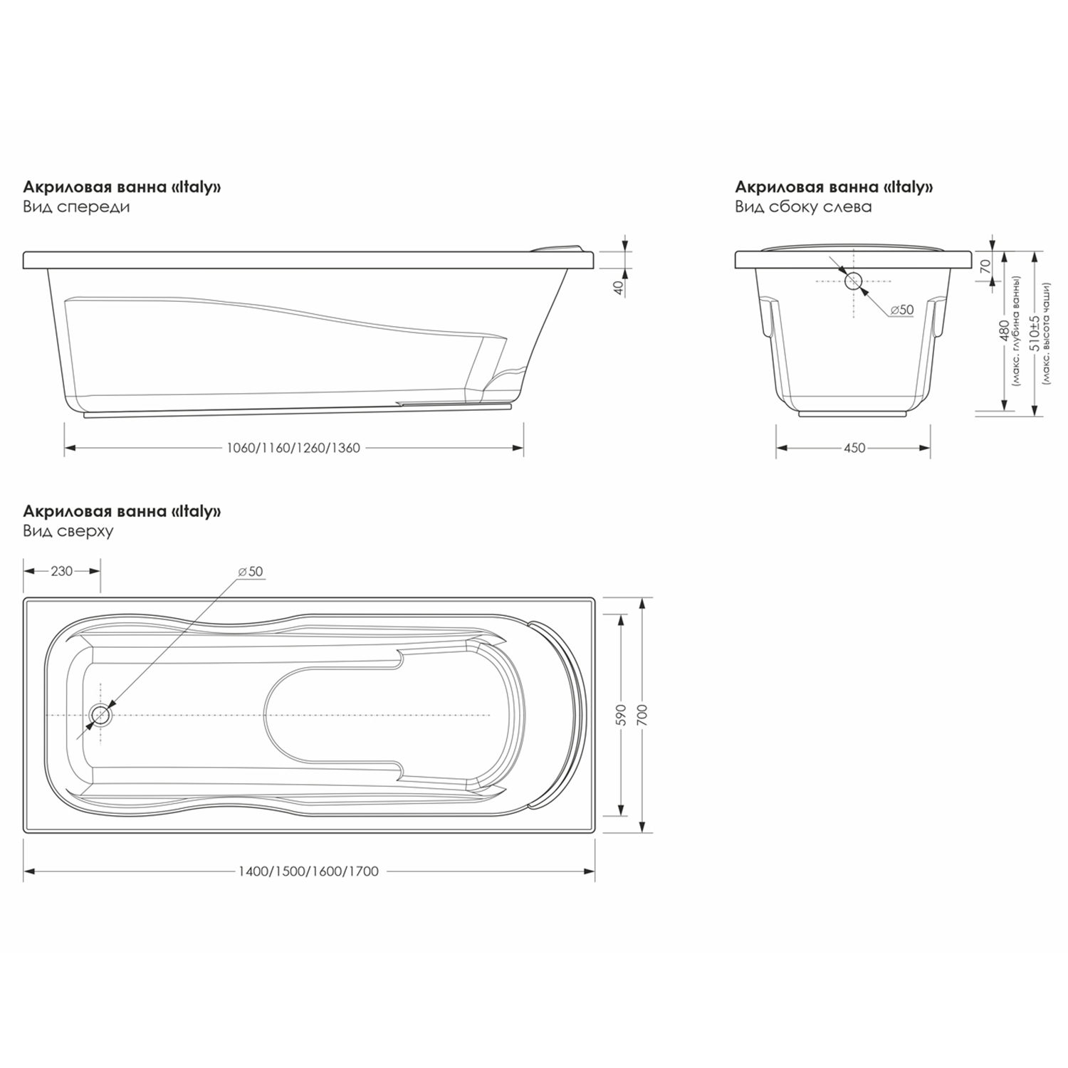 Глубокая акриловая ванна Italy с комфортным внутренним пространством и повышенной теплоизоляцией для длительного поддержания тепла в ванне.Изготовлена из ударопрочного и устойчивого к царапинам сантехнического акрила. Армирована жестким полиуретаном.Для очистки ванны следует использовать мягкую губку и моющие средства, которые подходят для акриловых ванн.Категорически запрещается использовать абразивные моющие средства, жесткие губки или щетки.Не допускайте контакта моющих средств с изделием более 5 минут.Рекомендуется раз в полгода проверять степень затяжки гаек на каркасе для ванны.Акриловая ванна Italy имеет собственную упаковку из гофрокартона крафт, которая защищает борта изделия по всему периметру. На дно ванны приклеивается стикер и вкладывается паспорт изделия.Объем ванны до края борта - 340л.Объем ванны до перелива - 260л.Диаметр сливного отверстия - 50мм.Максимальная нагрузка на дно ванны при установке на каркас - 500кг.
