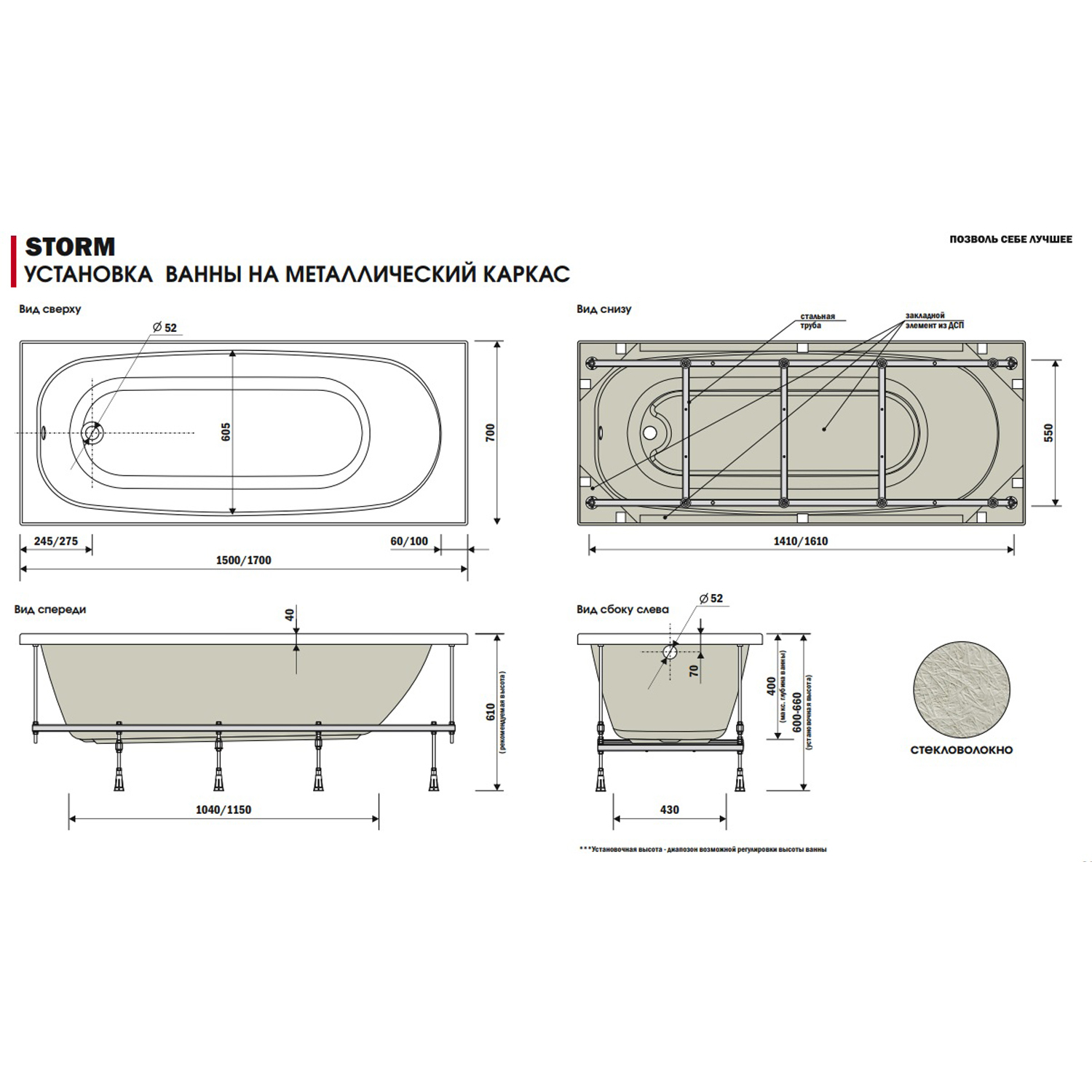 Ванна "Storm" изготовлена из сантехнического акрила, который обладает рядом преимуществ:- Ударопрочен- Устойчив к повреждениям и износу- Обладает антибактериальными свойствами- Имеет гладкую, блестящую поверхность и белоснежный цвет- СТЕКЛОРОВИНГ (послойное нанесение) придает ванне дополнительную жёсткость и создает повышенную теплоизоляцию.- Гарантия 5 летВанны оборачиваются защитной плёнкой для исключения случайных царапин, сколов, потёртостей до момента установки в ванной комнате.Каждая ванна имеет индивидуальную упаковку в гофрокартон и дополнительную фиксацию уголками для безопасной транспортировки.Глубина ванной - 400 ммОбъем до перелива: 1700х700 мм - 170лОбъем до краев: 1700х700 мм - 250лМаксимальная нагрузка: 500 кгДиаметр сливного отверстия - 52 мм