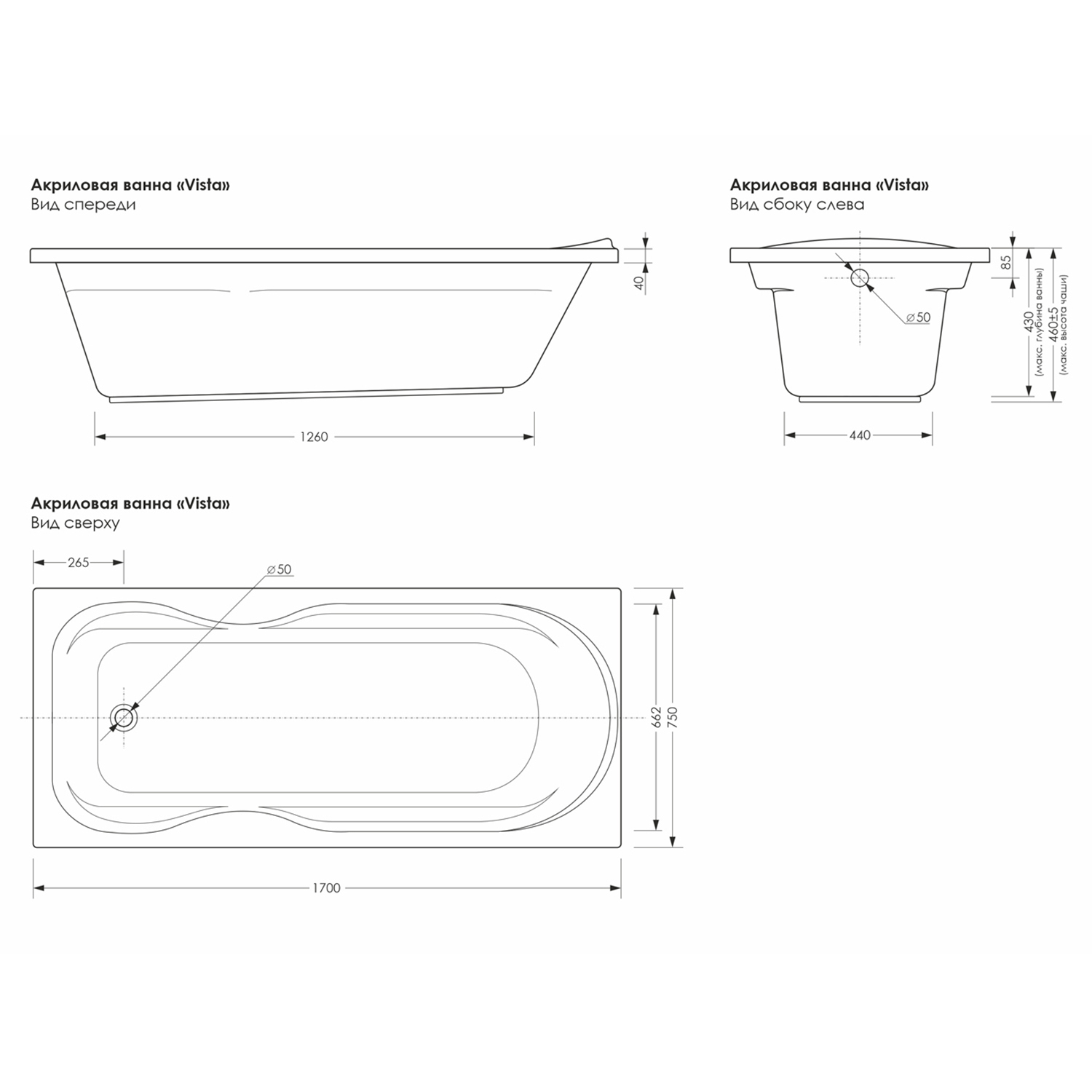 Просторная акриловая ванна Vista с комфортным внутренним пространством и с повышенной теплоизоляцией для длительного поддержания тепла в ванне. Изготовлена из ударопрочного и устойчивого к царапинам сантехнического акрила. Армирована жестким полиуретаном.Для очистки ванны следует использовать мягкую губку и моющие средства, которые подходят для акриловых ванн.Категорически запрещается использовать абразивные моющие средства, жесткие губки или щетки.Не допускайте контакта моющих средств с изделием более 5 минут.Рекомендуется раз в полгода проверять степень затяжки гаек на каркасе для ванны.Акриловая ванна Vista имеет собственную упаковку из гофрокартона крафт, которая защищает борта изделия по всему периметру. На дно ванны приклеивается стикер и вкладывается паспорт изделия.Объем ванны до края борта - 290л.Объем ванны до перелива - 210л.Диаметр сливного отверстия - 50мм.Максимальная нагрузка на дно ванны при установке на каркас - 500кг.