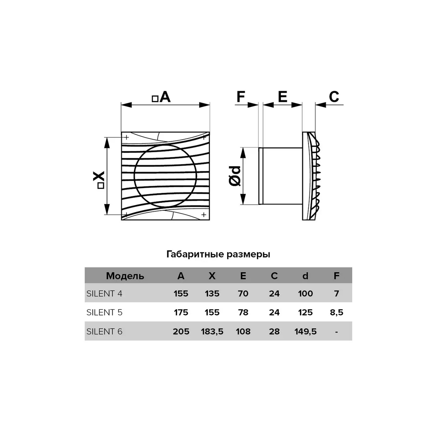 Бытовые вентиляторы используются для удаления из помещения отработанного воздуха.Чаще всего их устанавливают в санузлах, ванных комнатах и на кухнях.Благодаря работе вентилятора в помещении снижается уровень влажности, что защищает от образования плесени и грибка.Вентилятор SILENT 4C gray metal применяется для постоянной или периодической вытяжной вентиляции санузлов, душевых, кухонь и других бытовых помещений.Отличительной особенностью вентилятора является низкий уровень потребления энергии и почти бесшумная работа.Модель оснащена обратным клапаном, который предотвращает проникновение неприятных запахов из шахты. Конструкция крыльчатки повышает эффективность работы и срок службы вентилятора. Двигатель на шарикоподшипниках не требует дополнительного обслуживания и даёт возможность установить вентилятор как в вертикальном, так и в горизонтальном положении (при снятии обратного клапана).Изготовлен из долговечного ABS-пластика.Монтаж осуществляется с помощью саморезов, которые входят в комплект.