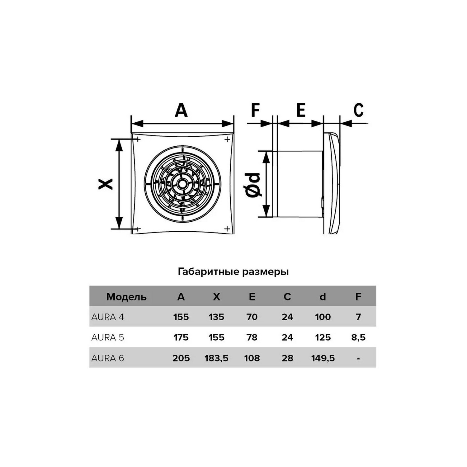 Бытовые вентиляторы используются для удаления из помещения отработанного воздуха. Чаще всего их устанавливают в санузлах, ванных комнатах и на кухнях. Благодаря работе вентилятора в помещении снижается уровень влажности, что защищает от образования плесени и грибка.Модель вентилятора AURA 5C оснащена обратным клапаном, который предотвращает проникновение неприятных запахов из шахты.Лицевая панель имеет светодиод голубого цвета, который загорается при включении вентилятора.Благодаря своей конструкции вентилятор обладает высокой производительностью и отличается малошумной работой.Долгий срок службы обеспечивает надёжный электродвигатель с низким энергопотреблением и крыльчатка аэродинамической формы.Двигатель на шарикоподшипниках не требует дополнительного обслуживания и даёт возможность установить вентилятор как в вертикальном, так и в горизонтальном положении (при снятии обратного клапана).Монтаж осуществляется с помощью саморезов, которые входят в комплект.