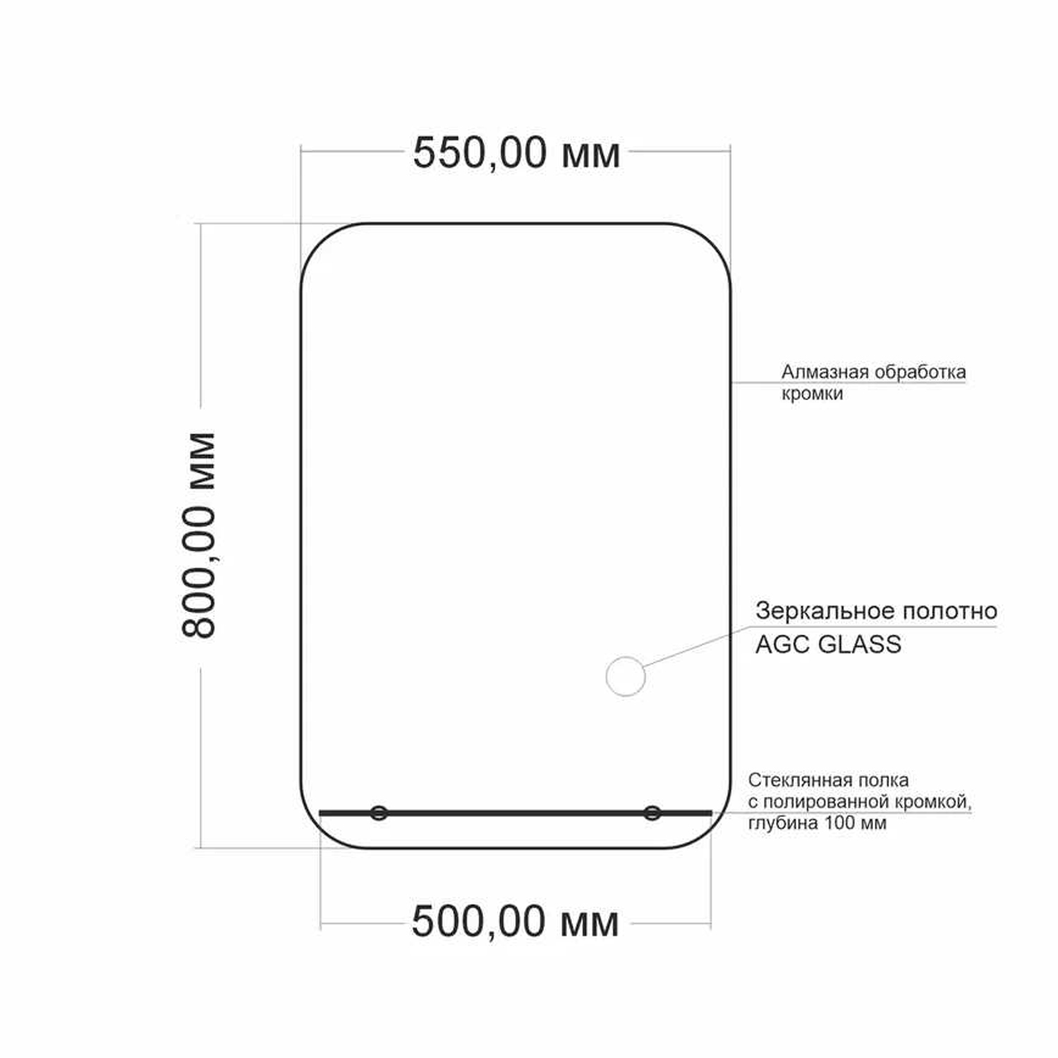 Современное прямоугольное зеркало с мягкими радиусными углами и удобной стеклянной полкой. Идеальное сочетание стиля и функциональности.