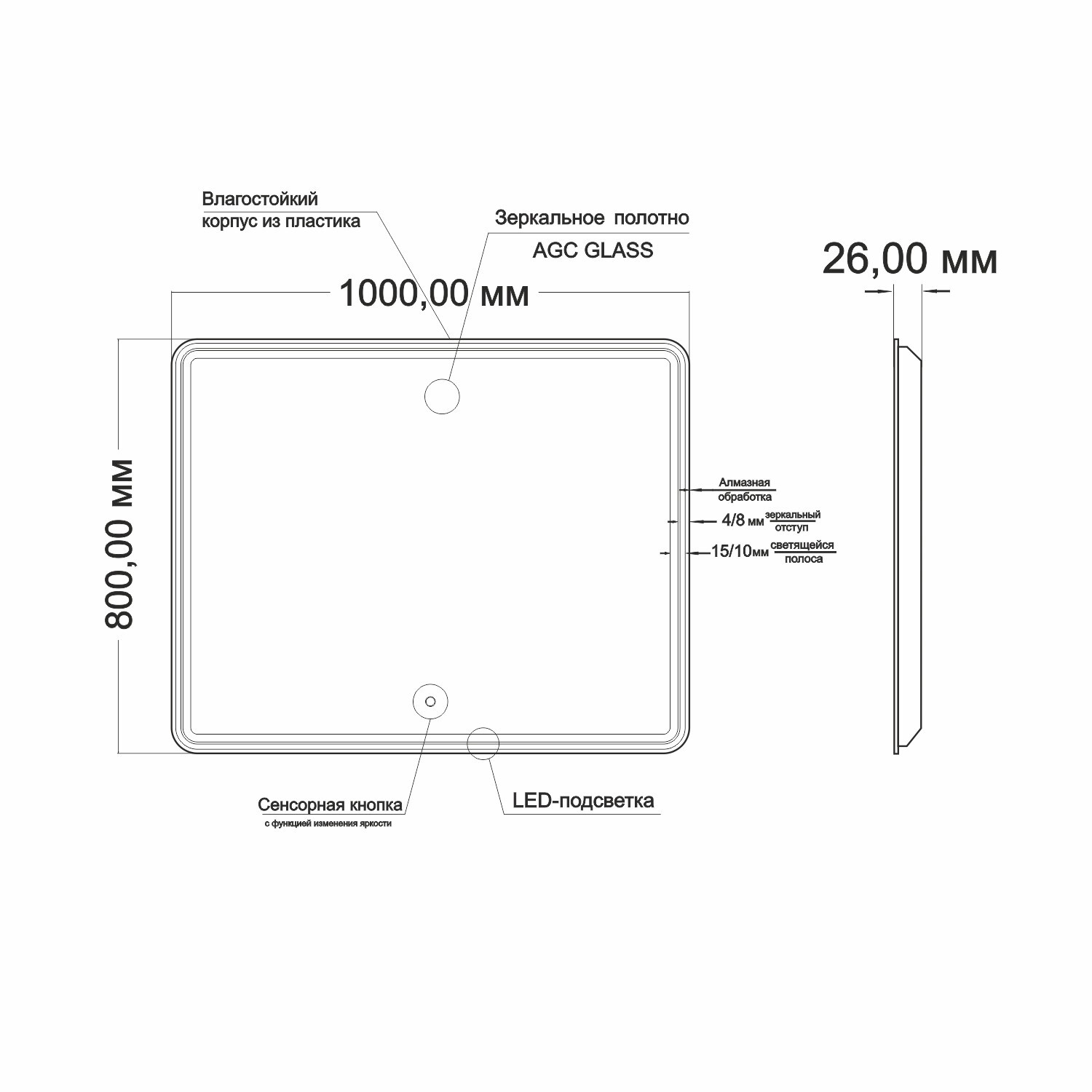Настенное зеркало для ванной Mixline с подсветкой 100 х 80 см изготовлено из зеркального полотна толщиной 4 мм. Оснащено сенсорным выключателем и диммером, который при удержании пальца на сенсоре позволяет менять интенсивность освещения. Свет белый (холодный 5800К - 6300К). Срок службы диодов - 100 000 часов.Все электрические компоненты размещены внутри корпуса из Abs-пластика, который защищает от влаги и механических повреждений. В качестве элемента подсветки используется светодиодная лента, которая обеспечивает яркое свечение по периметру зеркала. Зеркало влагостойкое и защищено от попадания случайных брызг и капель воды. Современная светодиодная подсветка с влагозащитой IP20-IP33 обеспечивает не только эффектное освещение, но и надёжную работу в условиях повышенной влажности. Для изготовления продукции мы используем материалы высокого качества - серебряное влагостойкое зеркальное полотно от AEK (AGC Glass Russia - российская ветвь AGC Glass Europe).Комплектация: паспорт и крепеж.