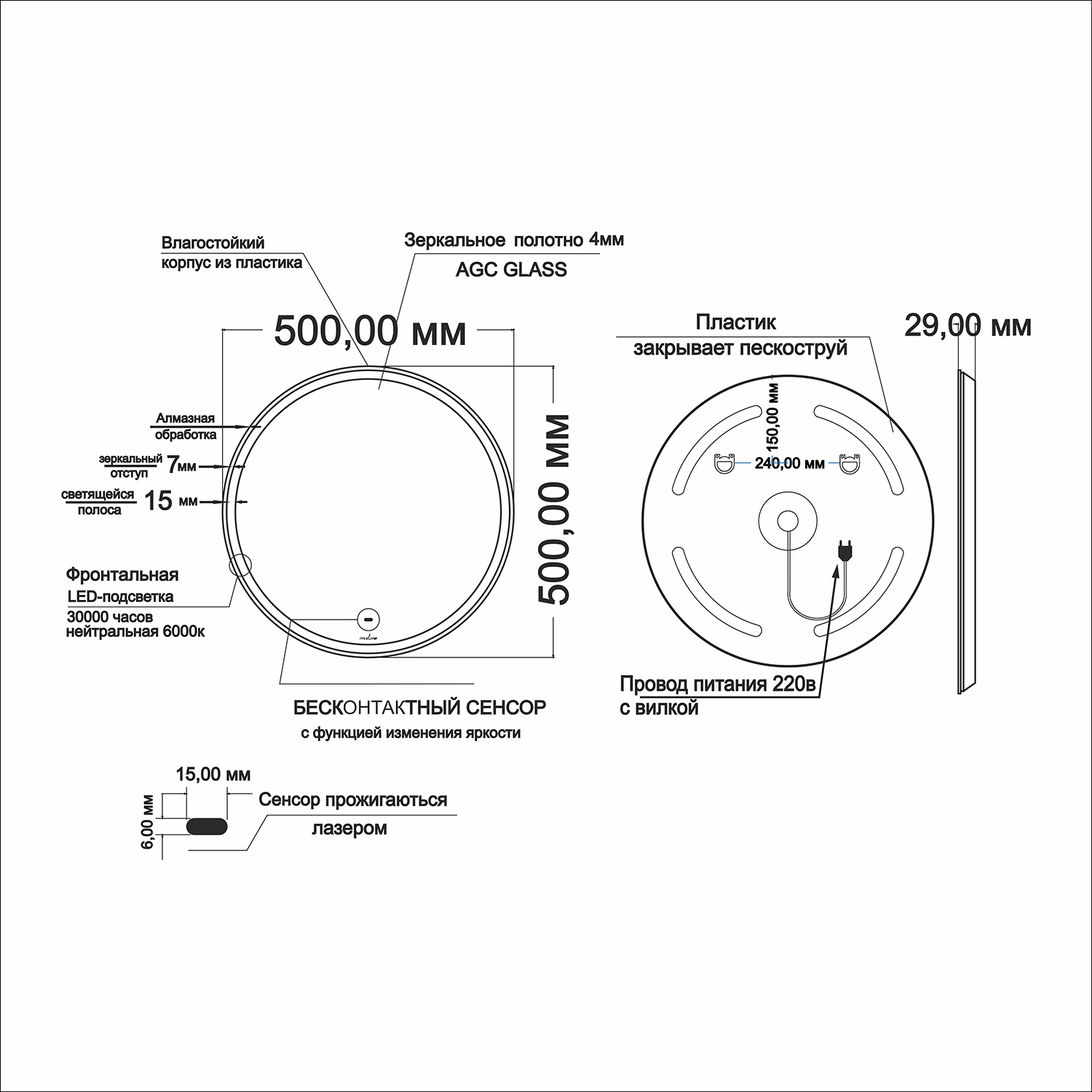 Настенное зеркало для ванной Mixline с подсветкой 50 х 50 см изготовлено из зеркального полотна толщиной 4 мм. Оснащено бесконтактным сенсором и диммером, который позволяет менять интенсивность освещения.Свет белый (холодный 5800К - 6300К). Срок службы диодов - 100 000 часов.Все электрические компоненты размещены внутри корпуса из Abs-пластика, который защищает от влаги и механических повреждений. В качестве элемента подсветки используется светодиодная лента, которая обеспечивает яркое свечение по периметру зеркала. Зеркало влагостойкое и защищено от попадания случайных брызг и капель воды.Современная светодиодная подсветка с влагозащитой IP20-IP33 обеспечивает не только эффектное освещение, но и надёжную работу в условиях повышенной влажности. Для изготовления продукции мы используем материалы высокого качества - серебряное влагостойкое зеркальное полотно от AEK (AGC Glass Russia - российская ветвь AGC Glass Europe).Комплектация: паспорт и крепеж.