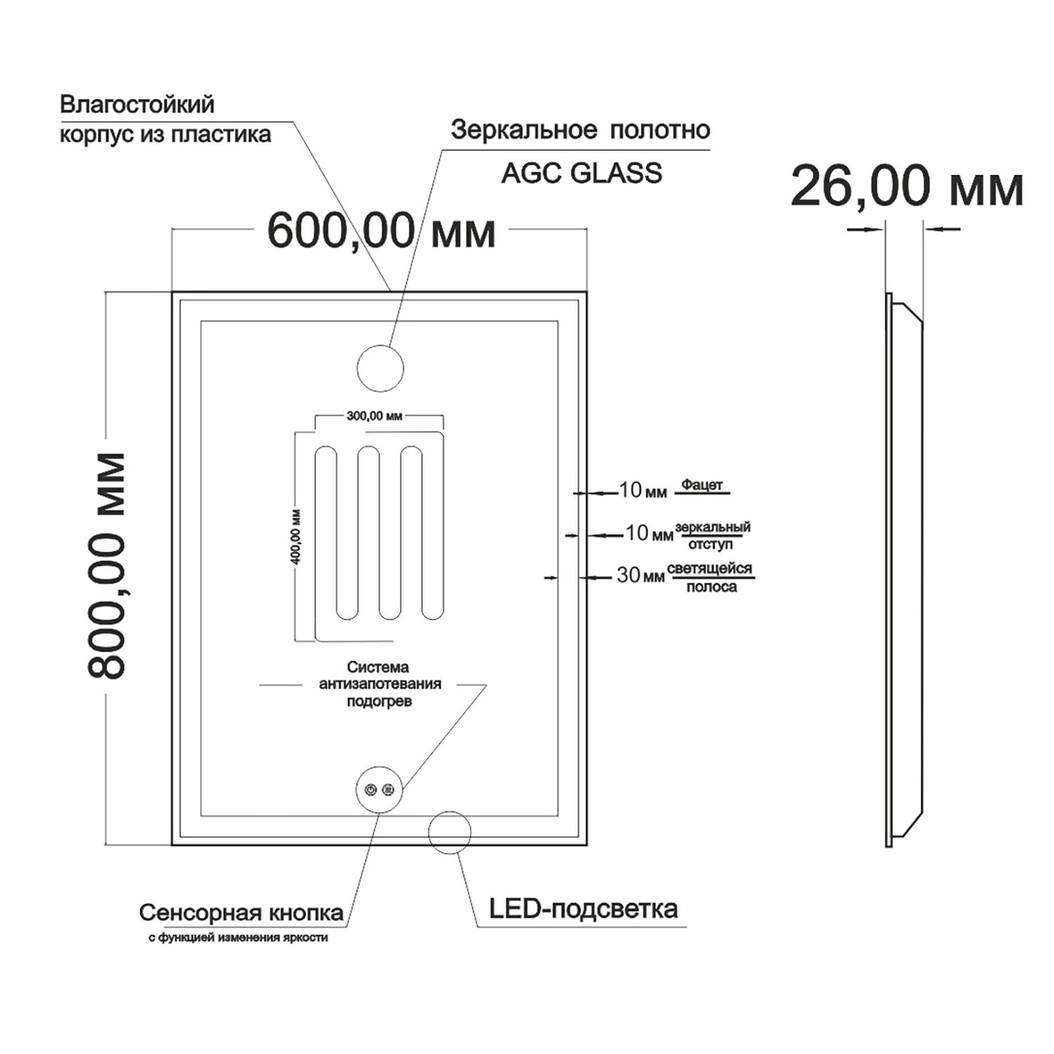 Настенное зеркало для ванной Mixline с подсветкой 60 х 80 см изготовлено из зеркального полотна толщиной 4 мм. Оснащено сенсорным выключателем и диммером, который при удержании пальца на сенсоре позволяет менять интенсивность освещения. Свет белый (холодный 5800К - 6300К). Срок службы диодов - 100 000 часов.Все электрические компоненты размещены внутри корпуса из Abs-пластика, который защищает от влаги и механических повреждений. В качестве элемента подсветки используется светодиодная лента, которая обеспечивает яркое свечение по периметру зеркала. Зеркало влагостойкое и защищено от попадания случайных брызг и капель воды.Подогрев полотна исключит запотевание зеркальной поверхности. Современная светодиодная подсветка с влагозащитой IP20-IP33 обеспечивает не только эффектное освещение, но и надёжную работу в условиях повышенной влажности. Для изготовления продукции мы используем материалы высокого качества - серебряное влагостойкое зеркальное полотно от AEK (AGC Glass Russia - российская ветвь AGC Glass Europe).Комплектация: паспорт и крепеж.