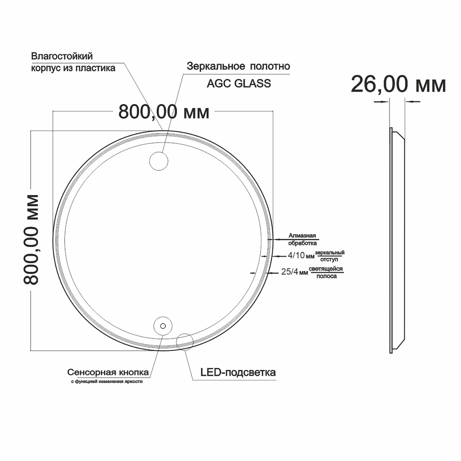 Настенное круглое зеркало для ванной Mixline с подсветкой D 80 см изготовлено из зеркального полотна толщиной 4 мм.Оснащено сенсорным выключателем и диммером, который при удержании пальца на сенсоре позволяет менять интенсивность освещения. Свет белый (холодный 5800К - 6300К). Срок службы диодов - 100 000 часов.Все электрические компоненты размещены внутри корпуса из Abs-пластика, который защищает от влаги и механических повреждений. В качестве элемента подсветки используется светодиодная лента, которая обеспечивает яркое свечение по периметру зеркала. Зеркало влагостойкое и защищено от попадания случайных брызг и капель воды.Современная светодиодная подсветка с влагозащитой IP20-IP33 обеспечивает не только эффектное освещение, но и надёжную работу в условиях повышенной влажности. Для изготовления продукции мы используем материалы высокого качества - серебряное влагостойкое зеркальное полотно от AEK (AGC Glass Russia - российская ветвь AGC Glass Europe).Комплектация: паспорт и крепеж.