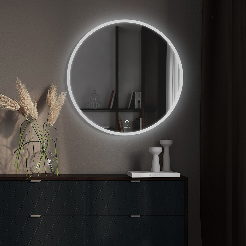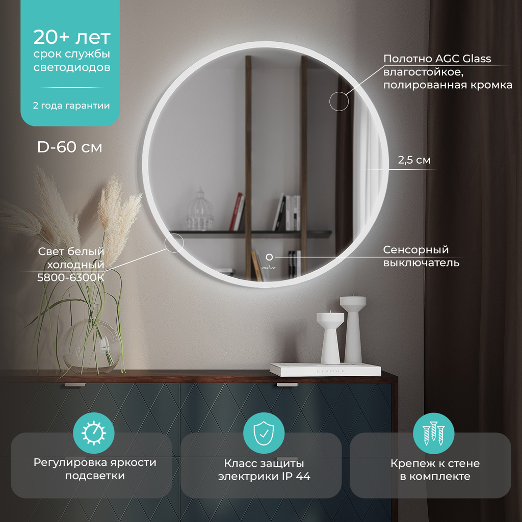 Зеркало MIXLINE «Перла» ЭКОНОМ с подсветкойКруглое зеркало MIXLINE «Перла» ЭКОНОМ с интегрированной светодиодной подсветкой – это элегантное решение для создания уютной и функциональной атмосферы в вашем доме. Благодаря лаконичной форме, лишенной острых углов, оно привносит в интерьер мягкость и гармонию, визуально смягчая пространство. Модель оснащена сенсорным управлением и диммером для плавной регулировки яркости, что делает её идеальным выбором для ванной комнаты, прихожей или любой другой зоны.Ключевые особенности:- Светодиодная подсветка по периметру: Равномерное рассеянное освещение создает эффект мягкого свечения, идеально подходящего для нанесения макияжа, ухода за собой или просто для создания расслабляющей обстановки.- Сенсорное управление с диммером: Включение, выключение и регулировка яркости выполняются легким касанием. Позволяет настроить освещение под любые задачи и время суток.- Идеальная геометрия: Круглая форма без острых углов делает зеркало безопасным и универсальным решением, которое гармонично вписывается в интерьеры любого стиля – от современного до классического.- Универсальность применения: Благодаря нейтральному дизайну и функциональной подсветке зеркало одинаково хорошо смотрится в ванной, прихожей, спальне или гардеробной.Преимущества модели «Перла»:- LED-подсветка с длительным ресурсом работы.- Мягкий рассеянный свет без бликов и мерцания.- Качественное зеркальное полотно с четким отражением.- Простой и безопасный монтаж.Зеркало MIXLINE «Перла» – это гармоничное сочетание эстетики и современных технологий. Выберите подходящий размер и наполните своё пространство мягким светом и стилем.