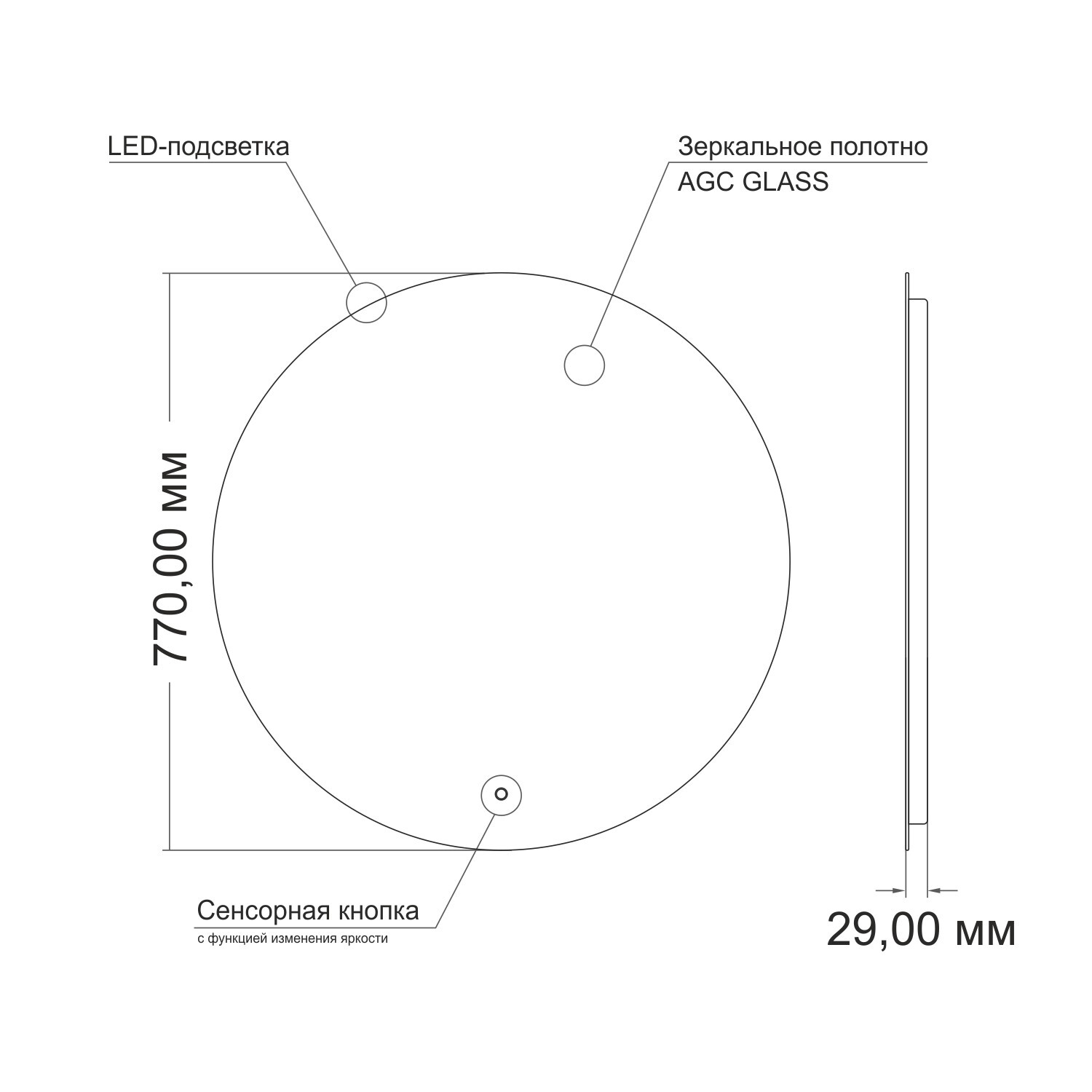 Круглое зеркало MIXLINE "Саванна" с простой геометрией смотрится изыскано благодаря имеющейся подсветке по периметру. В качестве элемента подсветки используется светодиодная лента. Зеркало оснащено сенсорным выключателем и диммером, который при удержании пальца на сенсоре позволяет менять интенсивность освещения. Зеркало изготовлено из зеркального полотна толщиной 4 мм, которое гарантирует четкое отражение и отсутствие искажений. В качестве элемента подсветки используется светодиодная лента. Свет - белый (холодный 5800-6300К). Срок службы диодов - 100 000 часов.Современная светодиодная подсветка с влагозащитой IP20-IP33 обеспечивает не только эффектное освещение, но и надёжную работу в условиях повышенной влажности. Для изготовления продукции мы используем материалы высокого качества - серебряное влагостойкое зеркальное полотно от AEK (AGC Glass Russia - российская ветвь AGC Glass Europe).