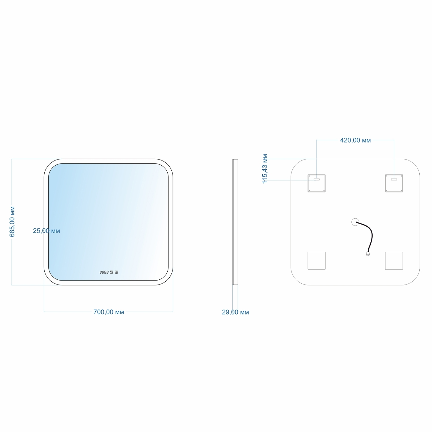 Настенное зеркало для ванной Mixline с подсветкой 70 х 68 см изготовлено из зеркального полотна толщиной 4 мм. Оснащено сенсорным выключателем и диммером, который при удержании пальца на сенсоре позволяет менять интенсивность освещения. Свет белый 6000К. Срок службы диодов - 100 000 часов.В качестве элемента подсветки используется светодиодная лента, которая обеспечивает яркое свечение по периметру зеркала. Все электрические компоненты размещены внутри корпуса из Abs-пластика, который защищает от влаги и механических повреждений. Зеркало влагостойкое и защищено от попадания случайных брызг и капель воды.Наличие встроенного таймера в модуле, который автоматически выключает активную функцию:- подогрев, часы (отключается автоматически через 60 мин. и подогрев и подсветка, если включена была только подсветка, заначит выключится она) - часы (через 60 мин. автоматически выключится подсветка).Подогрев полотна исключит запотевание зеркальной поверхности.Поле для отображения часов нанесено методом лазерной гравировки. Время регулируется с помощью сенсорной кнопки.Современная светодиодная подсветка с влагозащитой IP20-IP33 обеспечивает не только эффектное освещение, но и надёжную работу в условиях повышенной влажности. Для изготовления продукции мы используем материалы высокого качества - серебряное влагостойкое зеркальное полотно от AEK (AGC Glass Russia - российская ветвь AGC Glass Europe).Комплектация: крепеж, инструкция.