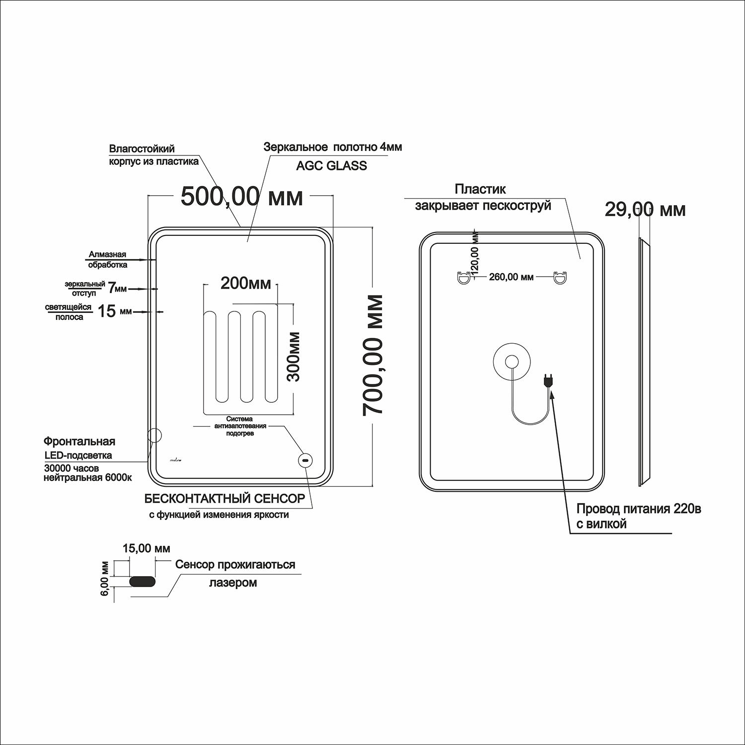 Настенное зеркало для ванной Mixline с подсветкой 50 х 70 см изготовлено из зеркального полотна толщиной 4 мм. Оснащено подогревом зеркального полотна, бесконтактным сенсором и диммером, который позволяет менять интенсивность освещения. Свет белый (холодный 5800К - 6300К). Срок службы диодов - 100 000 часов.Все электрические компоненты размещены внутри корпуса из Abs-пластика, который защищает от влаги и механических повреждений. В качестве элемента подсветки используется светодиодная лента, которая обеспечивает яркое свечение по периметру зеркала. Зеркало влагостойкое и защищено от попадания случайных брызг и капель воды.Современная светодиодная подсветка с влагозащитой IP20-IP33 обеспечивает не только эффектное освещение, но и надёжную работу в условиях повышенной влажности. Для изготовления продукции мы используем материалы высокого качества - серебряное влагостойкое зеркальное полотно от AEK (AGC Glass Russia - российская ветвь AGC Glass Europe).Комплектация: паспорт и крепеж.