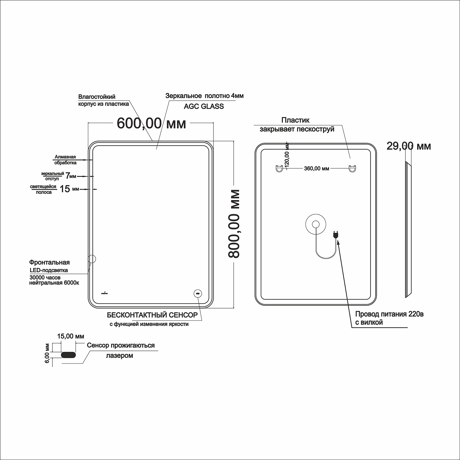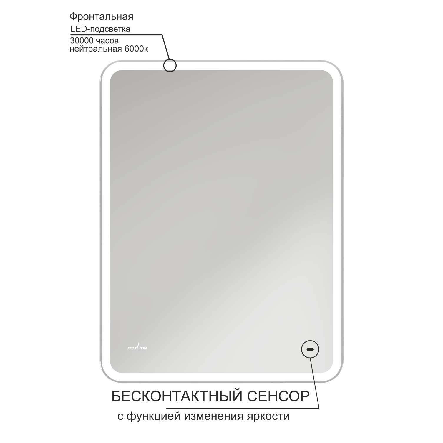 Настенное зеркало для ванной Mixline с подсветкой 60 х 80 см изготовлено из зеркального полотна толщиной 4 мм. Оснащено бесконтактным сенсором и диммером, который позволяет менять интенсивность освещения. Свет белый (холодный 5800К - 6300К). Срок службы диодов - 100 000 часов.Все электрические компоненты размещены внутри корпуса из Abs-пластика, который защищает от влаги и механических повреждений. В качестве элемента подсветки используется светодиодная лента, которая обеспечивает яркое свечение по периметру зеркала. Зеркало влагостойкое и защищено от попадания случайных брызг и капель воды.Современная светодиодная подсветка с влагозащитой IP20-IP33 обеспечивает не только эффектное освещение, но и надёжную работу в условиях повышенной влажности. Для изготовления продукции мы используем материалы высокого качества - серебряное влагостойкое зеркальное полотно от AEK (AGC Glass Russia - российская ветвь AGC Glass Europe).Комплектация: паспорт и крепеж.