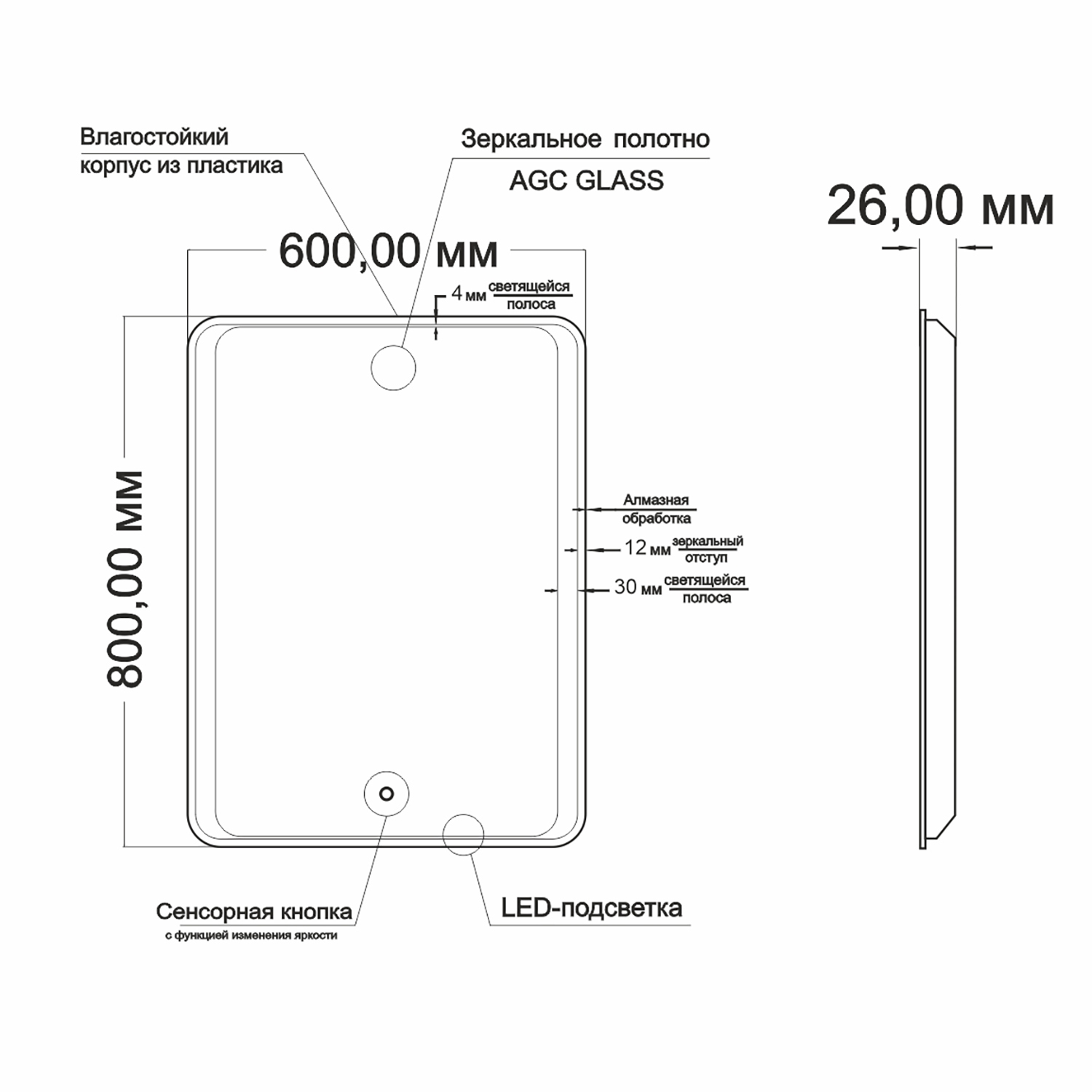 Настенное зеркало для ванной Mixline с подсветкой 60 х 80 см изготовлено из зеркального полотна толщиной 4 мм. Оснащено сенсорным выключателем и диммером, который при удержании пальца на сенсоре позволяет менять интенсивность освещения. Свет белый (холодный 5800К - 6300К). Срок службы диодов - 100 000 часов.Все электрические компоненты размещены внутри корпуса из Abs-пластика, который защищает от влаги и механических повреждений. В качестве элемента подсветки используется светодиодная лента, которая обеспечивает яркое свечение по периметру зеркала. Зеркало влагостойкое и защищено от попадания случайных брызг и капель воды.Современная светодиодная подсветка с влагозащитой IP20-IP33 обеспечивает не только эффектное освещение, но и надёжную работу в условиях повышенной влажности. Для изготовления продукции мы используем материалы высокого качества - серебряное влагостойкое зеркальное полотно от AEK (AGC Glass Russia - российская ветвь AGC Glass Europe).Комплектация: паспорт и крепеж.