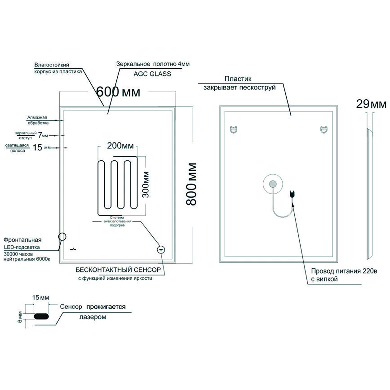 Настенное зеркало для ванной Mixline с подсветкой 60 х 80 см изготовлено из зеркального полотна толщиной 4 мм. Оснащено подогревом зеркального полотна, бесконтактным сенсором и диммером, который позволяет менять интенсивность освещения. Свет белый (холодный 5800К - 6300К). Срок службы диодов - 100 000 часов.Все электрические компоненты размещены внутри корпуса из Abs-пластика, который защищает от влаги и механических повреждений. В качестве элемента подсветки используется светодиодная лента, которая обеспечивает яркое свечение по периметру зеркала. Зеркало влагостойкое и защищено от попадания случайных брызг и капель воды.Современная светодиодная подсветка с влагозащитой IP20-IP33 обеспечивает не только эффектное освещение, но и надёжную работу в условиях повышенной влажности. Для изготовления продукции мы используем материалы высокого качества - серебряное влагостойкое зеркальное полотно от AEK (AGC Glass Russia - российская ветвь AGC Glass Europe).Комплектация: паспорт и крепеж.