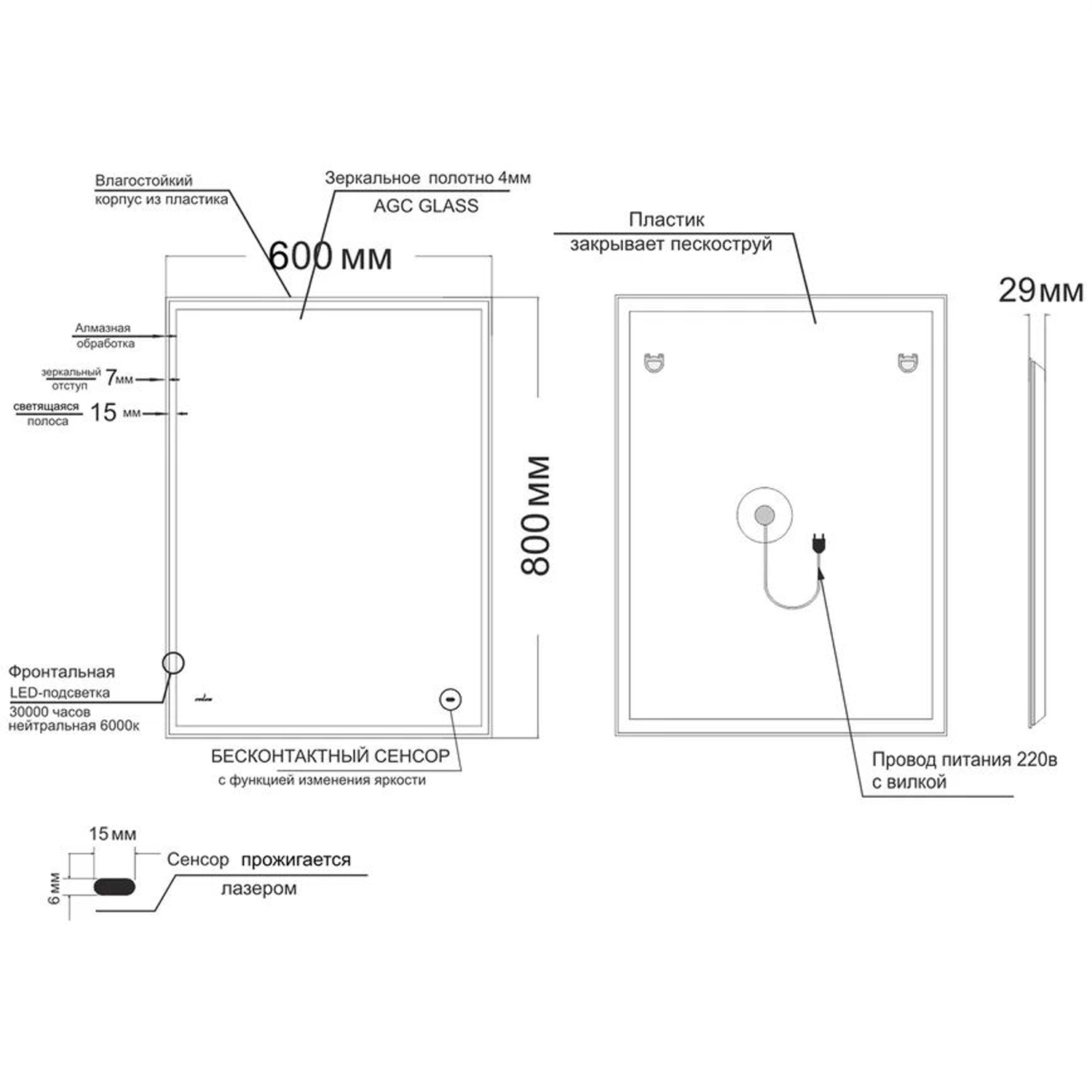 Настенное зеркало для ванной Mixline с подсветкой 60 х 80 см изготовлено из зеркального полотна толщиной 4 мм. Оснащено бесконтактным сенсором и диммером, который позволяет менять интенсивность освещения. Свет белый (холодный 5800К - 6300К). Срок службы диодов - 100 000 часов.Все электрические компоненты размещены внутри корпуса из Abs-пластика, который защищает от влаги и механических повреждений. В качестве элемента подсветки используется светодиодная лента, которая обеспечивает яркое свечение по периметру зеркала. Зеркало влагостойкое и защищено от попадания случайных брызг и капель воды.Современная светодиодная подсветка с влагозащитой IP20-IP33 обеспечивает не только эффектное освещение, но и надёжную работу в условиях повышенной влажности. Для изготовления продукции мы используем материалы высокого качества - серебряное влагостойкое зеркальное полотно от AEK (AGC Glass Russia - российская ветвь AGC Glass Europe).Комплектация: паспорт и крепеж.
